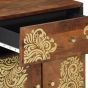 This bedside cabinet by is a striking mix of practicality and style, making it perfect for any bedroom. The gorgeous honey brown colour and golden floral design give it a sophisticated flair, making it a lovely addition to your home. Elegant Floral Design: With its vibrant golden floral pattern, this cabinet is more than just storage; it's a statement piece that enhances any room decor. Ample Storage Options: It has a roomy drawer along with two solid wood doors, perfect for keeping your essentials handy. Robust Construction: Made from top-quality solid mango wood, built to last and give your furniture collection a boost. Polished Surface Finish: The lacquered surface not only looks classy but is also easy to maintain and has a stunning glossy sheen. Versatile Use: Intended for the bedroom but flexible enough to fit in with various home decor styles and settings.