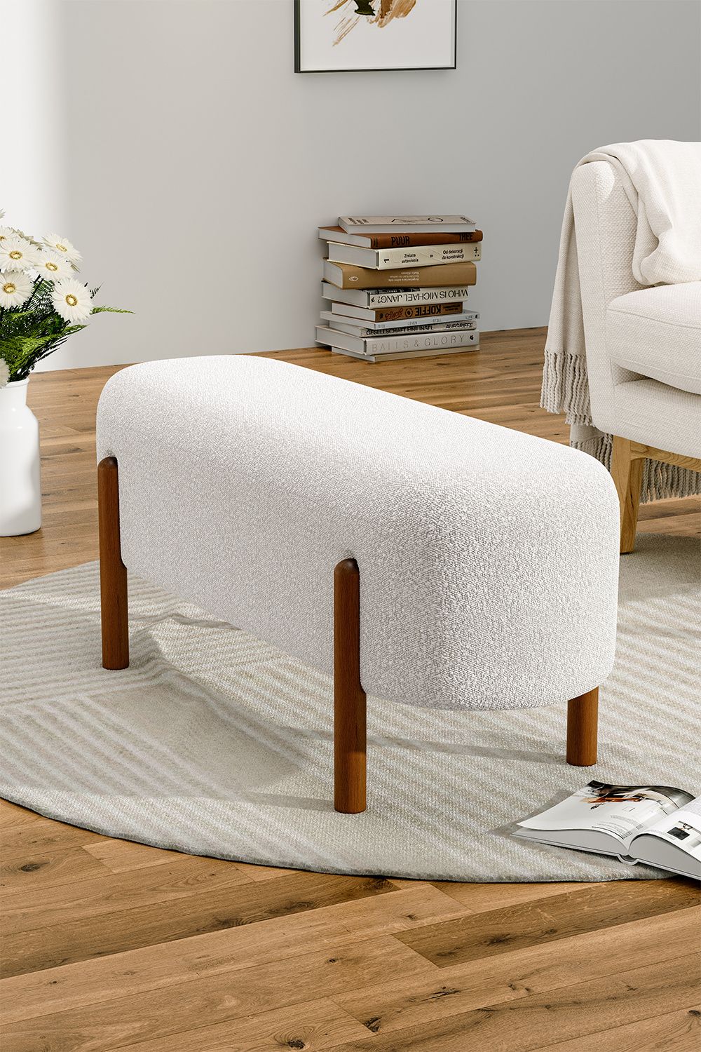 A versatile piece that can work as an additional seat at your entryway as well as an accent piece at the end of your bed, you must be looking for our contemporary bench. Supported by wooden legs in a rustic walnut finish, this bench is absolutely safe and steady to offer a seat for up to two people. Its clean lines and rounded legs create a beautiful silhouette and bring an elegant touch to your room.