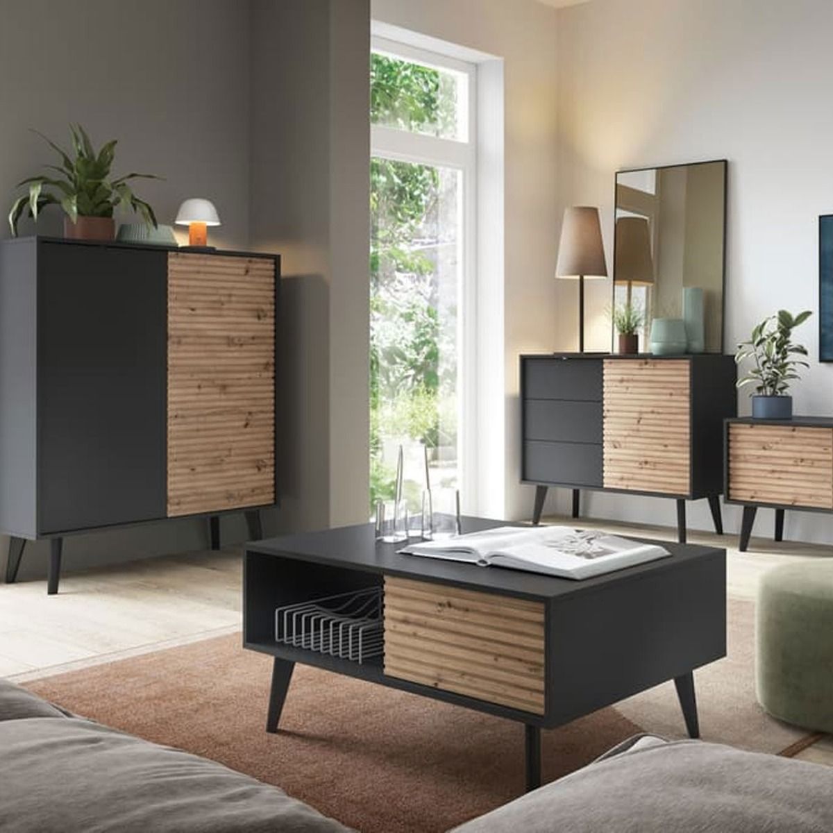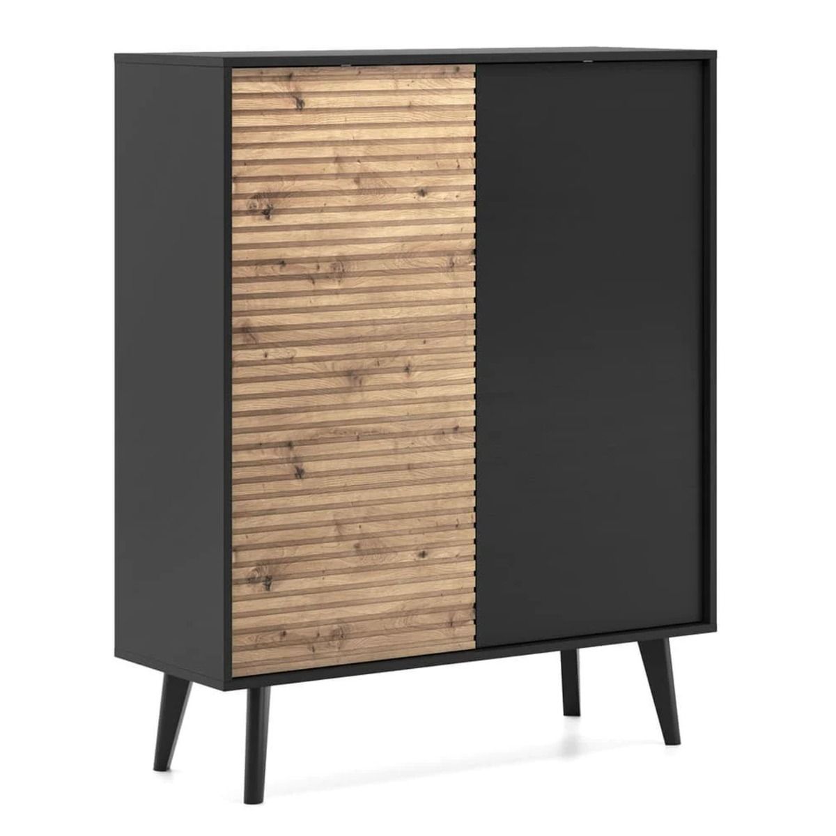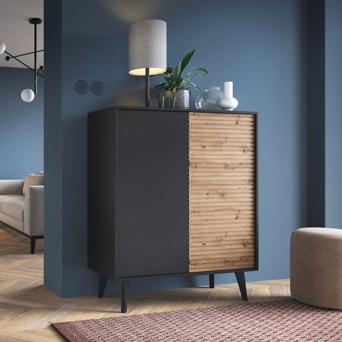 Elevate your living space with the Bella Hendrix Highboard Cabinet—a seamless fusion of modern design and functionality. Crafted in Oak Artisan and Black, it boasts two hinged doors with a convenient push-to-open system, revealing four shelves for versatile storage. The ABS edging ensures durability, while the black wooden legs add a touch of sophistication. Made from high-quality 16mm laminated board, this highboard cabinet is not just a piece of furniture but a stylish statement for your home. Assembly is required, offering you the opportunity to customize your living space effortlessly.