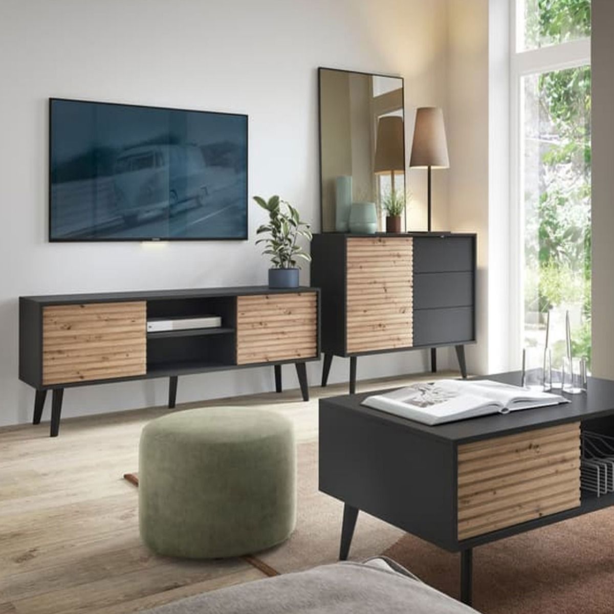 - Oak Artisan and Black finish for contemporary elegance