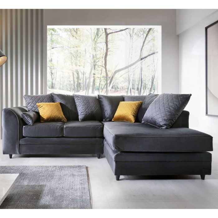 A sophisticated velvet corner sofa with fashionable and decisive clean lines. Available in understated, bold and neutral colour shades. Perfect for any contemporary living space. Angular arms, scatter cushions and a couple of tasteful toss pillows provide an elegantly modern look and feel. The luxurious feeling velvet fabric is coated with a special hydrophobic coating that will prevent stains, allowing you to simply wipe away accidental spills, spills that you know will happen! Short tapered legs give this corner beauty just enough lift to speak out its style.