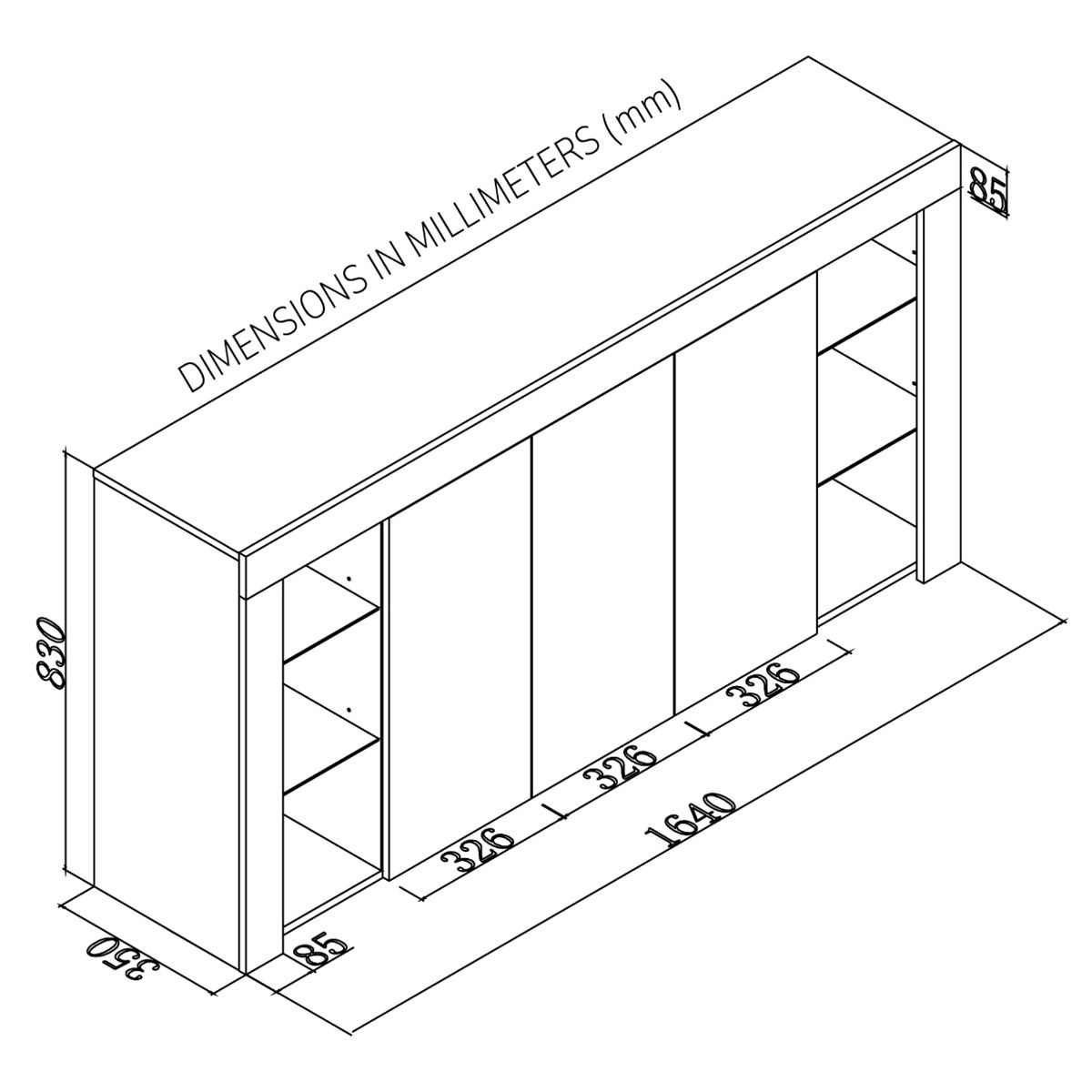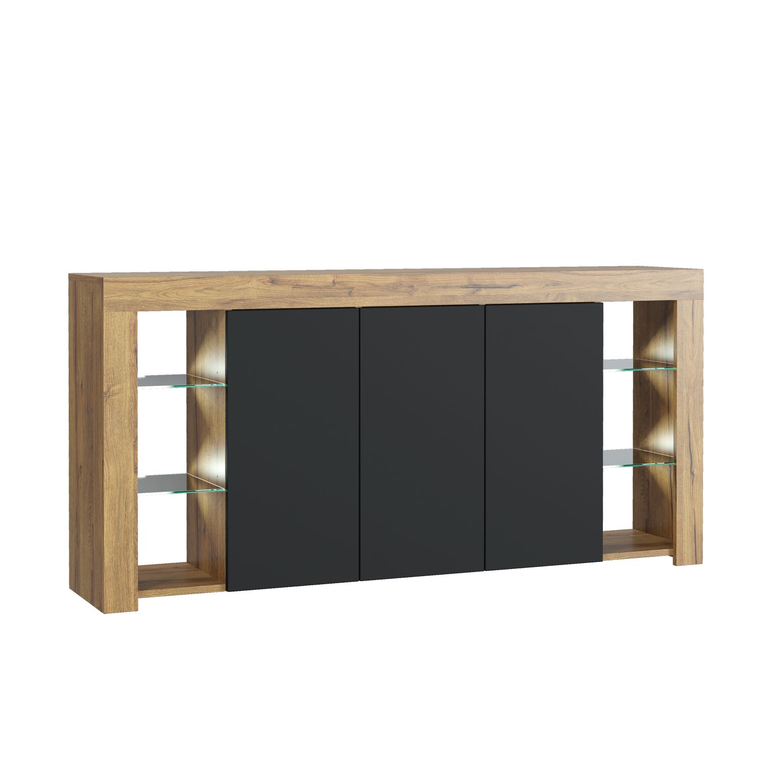 The BILBAO Sideboard combines contemporary design with functional storage, making it a sleek and elegant addition to your living space. Measuring 164cm (W) x 83cm (H) x 35cm (D), this cabinet offers ample storage and display options while enhancing the modern aesthetic of your home. The matte-finished body is complemented by glossy push-to-open doors, creating a clean and minimalist look that suits any interior. Behind each of the three doors, a shelf divides the storage space into two compartments, providing plenty of room to keep your essentials neatly organized and out of sight. For displaying decor, books, or cherished items, the sideboard features six open compartments and four glass shelves, offering a stunning showcase that is beautifully enhanced by LED lighting included in the set. Please note: the Oak with Black version features matte black doors, offering a unique and understated alternative to the glossy finishes available in other options. Available in White & Gloss Doors, White & Grey Gloss Doors, Black & Gloss Doors, Walnut & Black Gloss Doors, Oak & White Gloss Doors, Oak & Black Matt Doors, and Dark Grey & Gloss Doors.