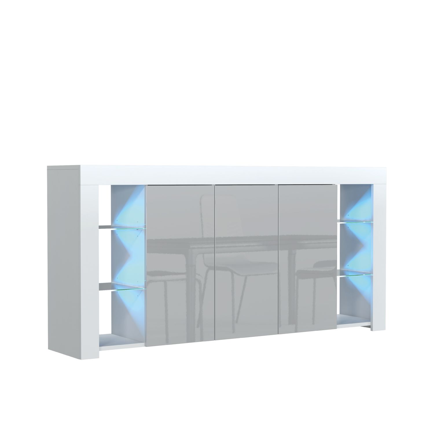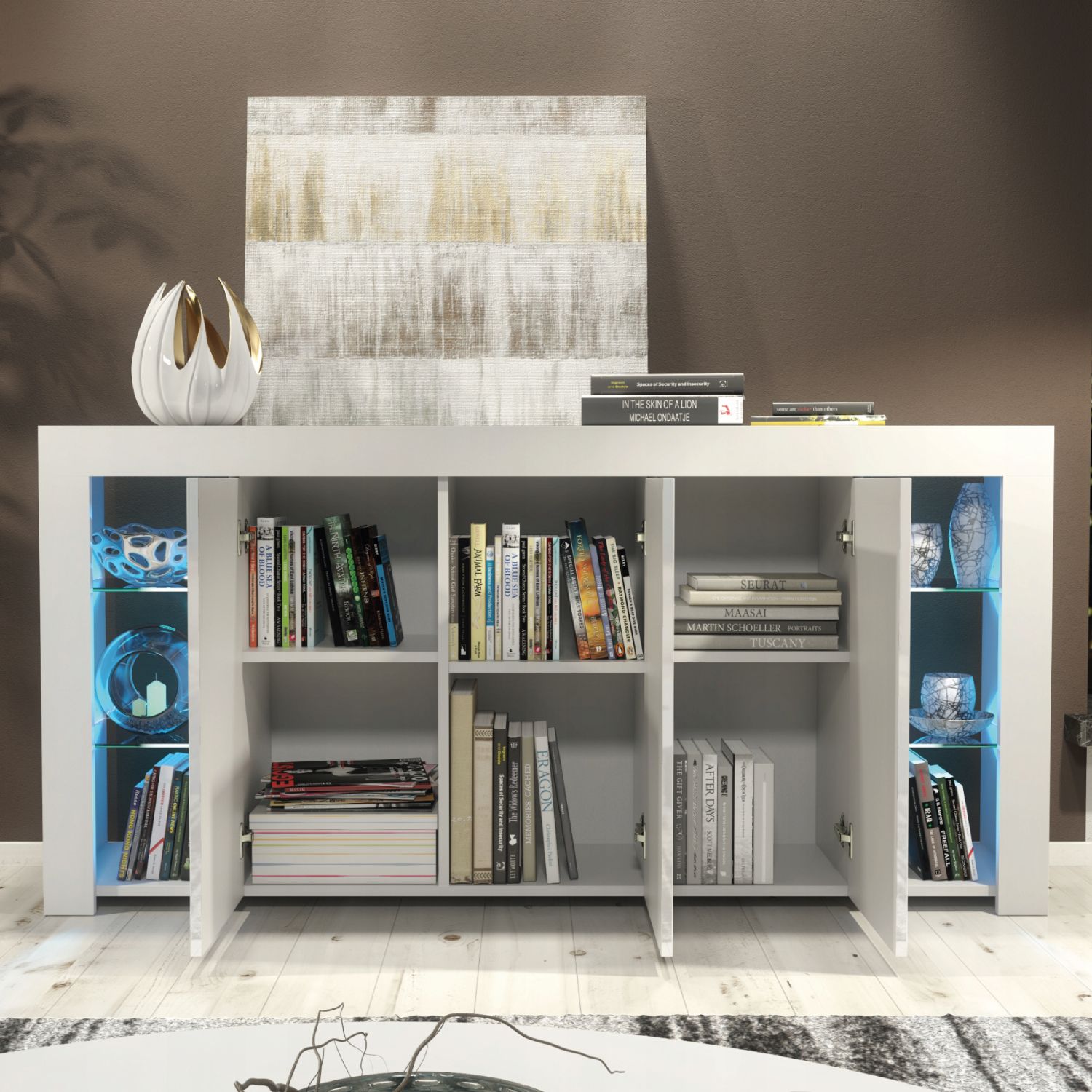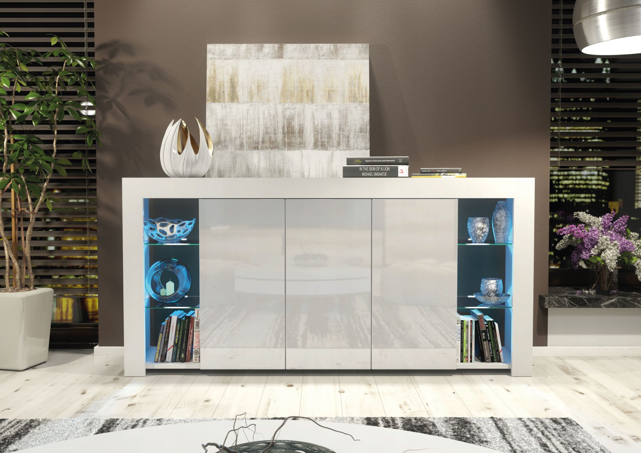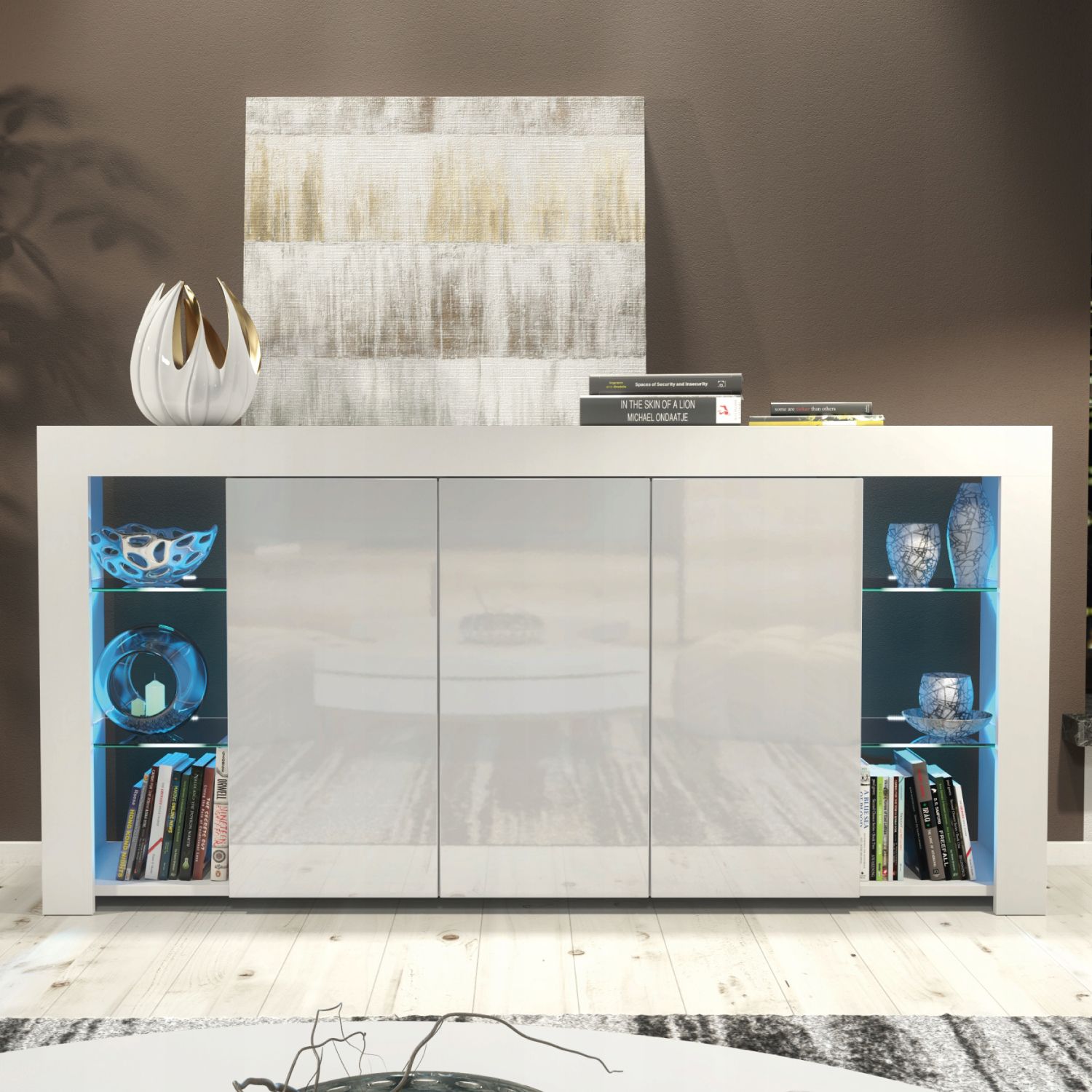 The BILBAO Sideboard combines contemporary design with functional storage, making it a sleek and elegant addition to your living space. Measuring 164cm (W) x 83cm (H) x 35cm (D), this cabinet offers ample storage and display options while enhancing the modern aesthetic of your home. The matte-finished body is complemented by glossy push-to-open doors, creating a clean and minimalist look that suits any interior. Behind each of the three doors, a shelf divides the storage space into two compartments, providing plenty of room to keep your essentials neatly organized and out of sight. For displaying decor, books, or cherished items, the sideboard features six open compartments and four glass shelves, offering a stunning showcase that is beautifully enhanced by LED lighting included in the set. Please note: the Oak with Black version features matte black doors, offering a unique and understated alternative to the glossy finishes available in other options. Available in White & Gloss Doors, White & Grey Gloss Doors, Black & Gloss Doors, Walnut & Black Gloss Doors, Oak & White Gloss Doors, Oak & Black Matt Doors, and Dark Grey & Gloss Doors.