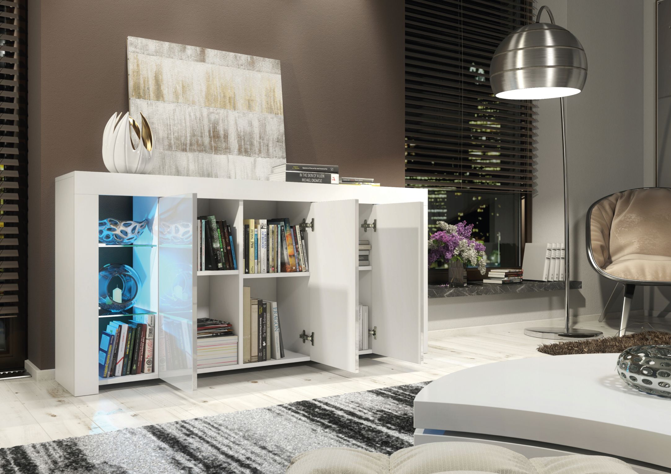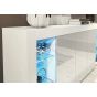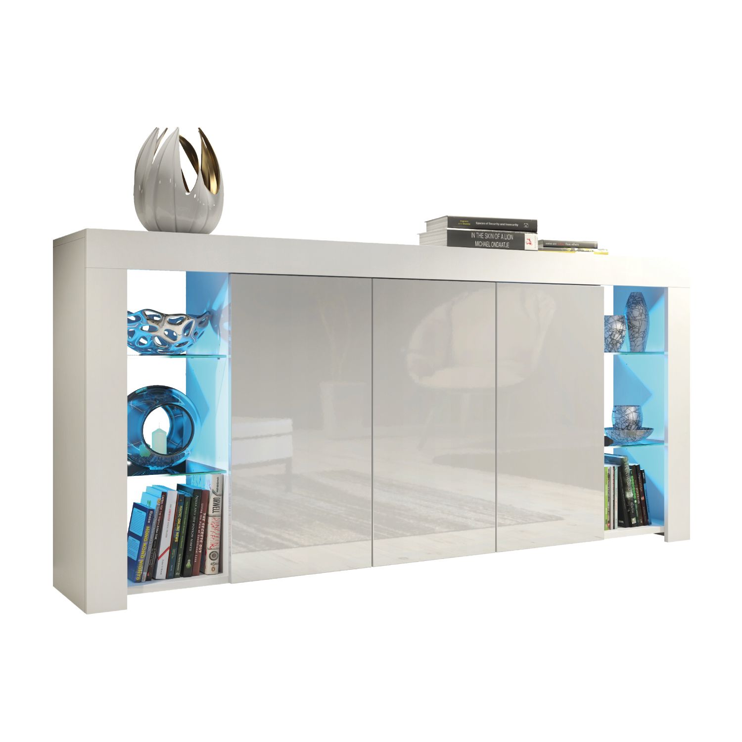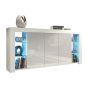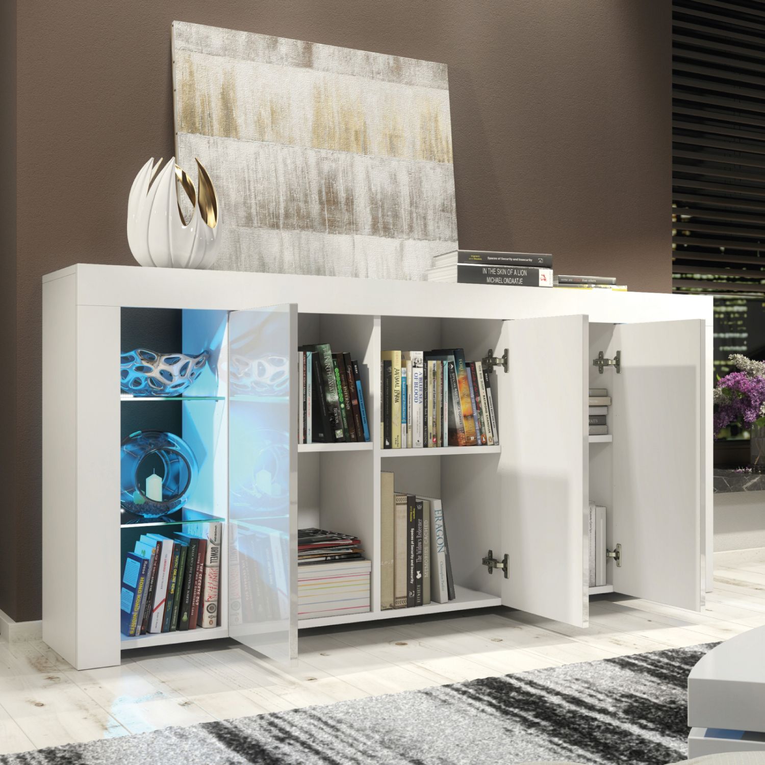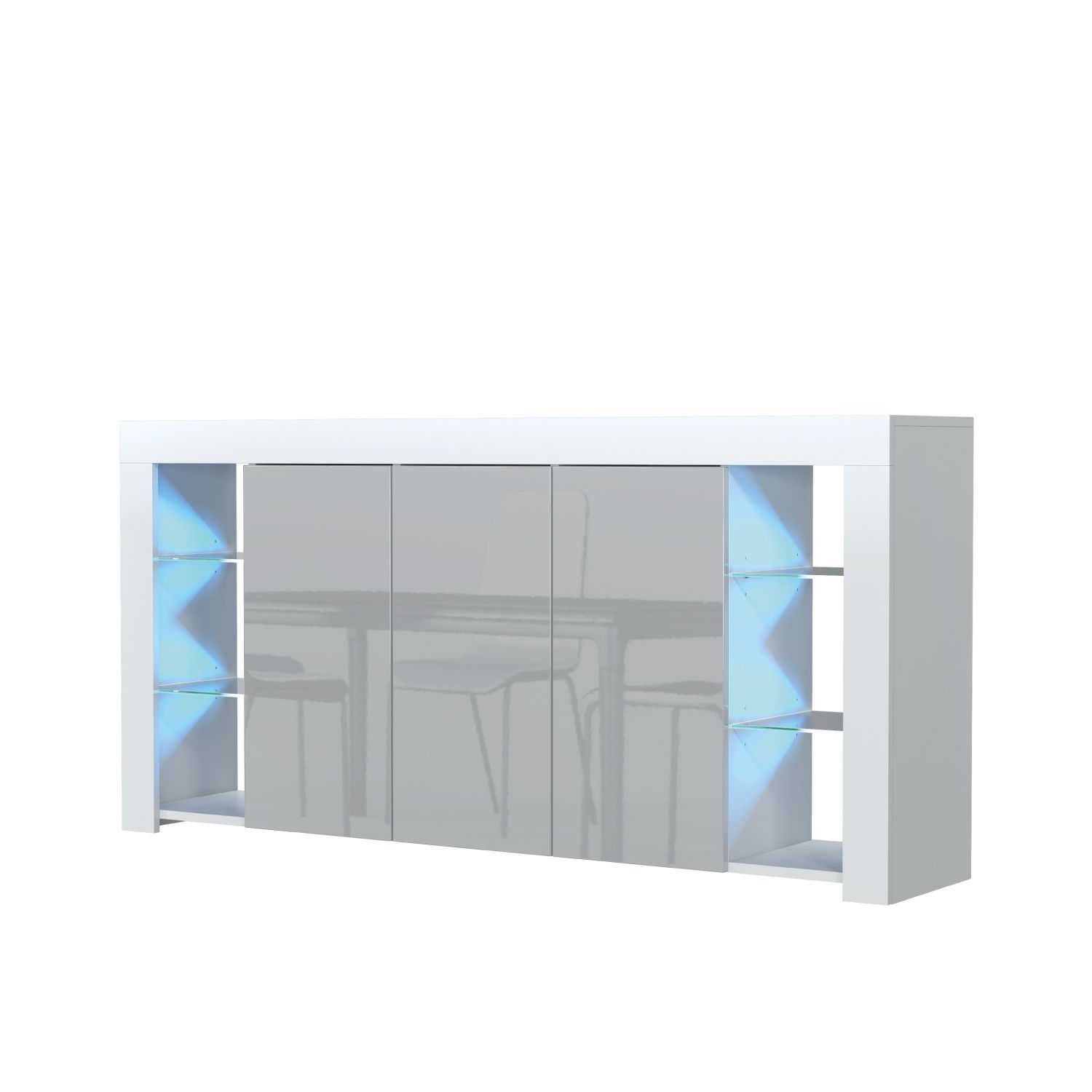 The BILBAO Sideboard combines contemporary design with functional storage, making it a sleek and elegant addition to your living space. Measuring 164cm (W) x 83cm (H) x 35cm (D), this cabinet offers ample storage and display options while enhancing the modern aesthetic of your home. The matte-finished body is complemented by glossy push-to-open doors, creating a clean and minimalist look that suits any interior. Behind each of the three doors, a shelf divides the storage space into two compartments, providing plenty of room to keep your essentials neatly organized and out of sight. For displaying decor, books, or cherished items, the sideboard features six open compartments and four glass shelves, offering a stunning showcase that is beautifully enhanced by LED lighting included in the set. Please note: the Oak with Black version features matte black doors, offering a unique and understated alternative to the glossy finishes available in other options. Available in White & Gloss Doors, White & Grey Gloss Doors, Black & Gloss Doors, Walnut & Black Gloss Doors, Oak & White Gloss Doors, Oak & Black Matt Doors, and Dark Grey & Gloss Doors.