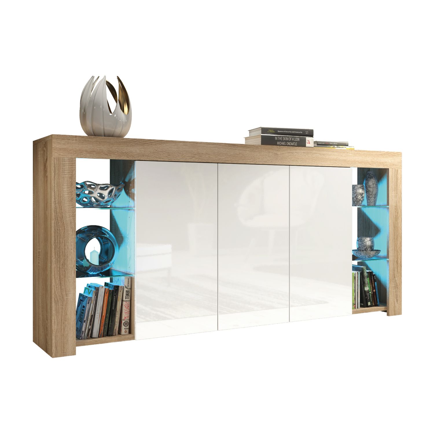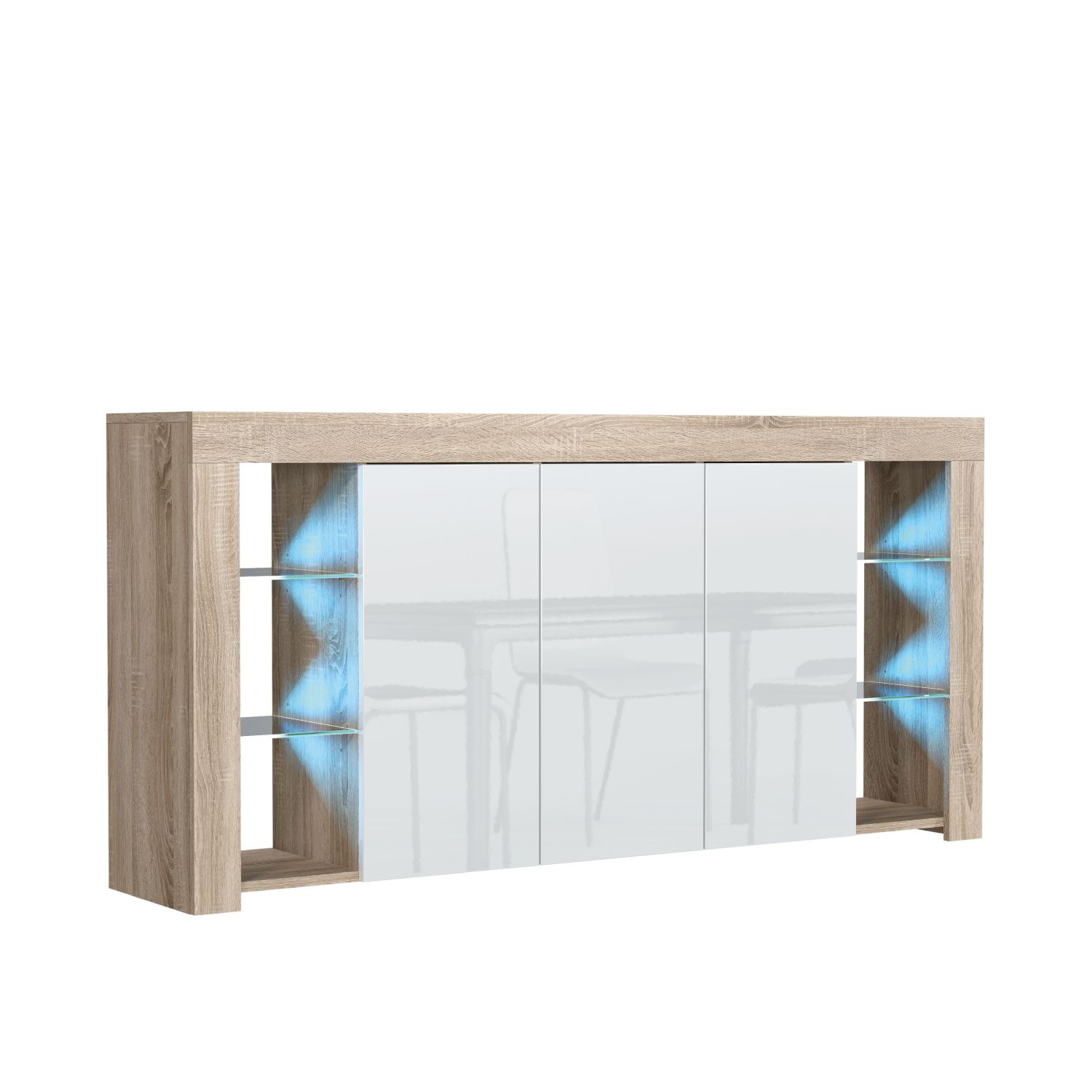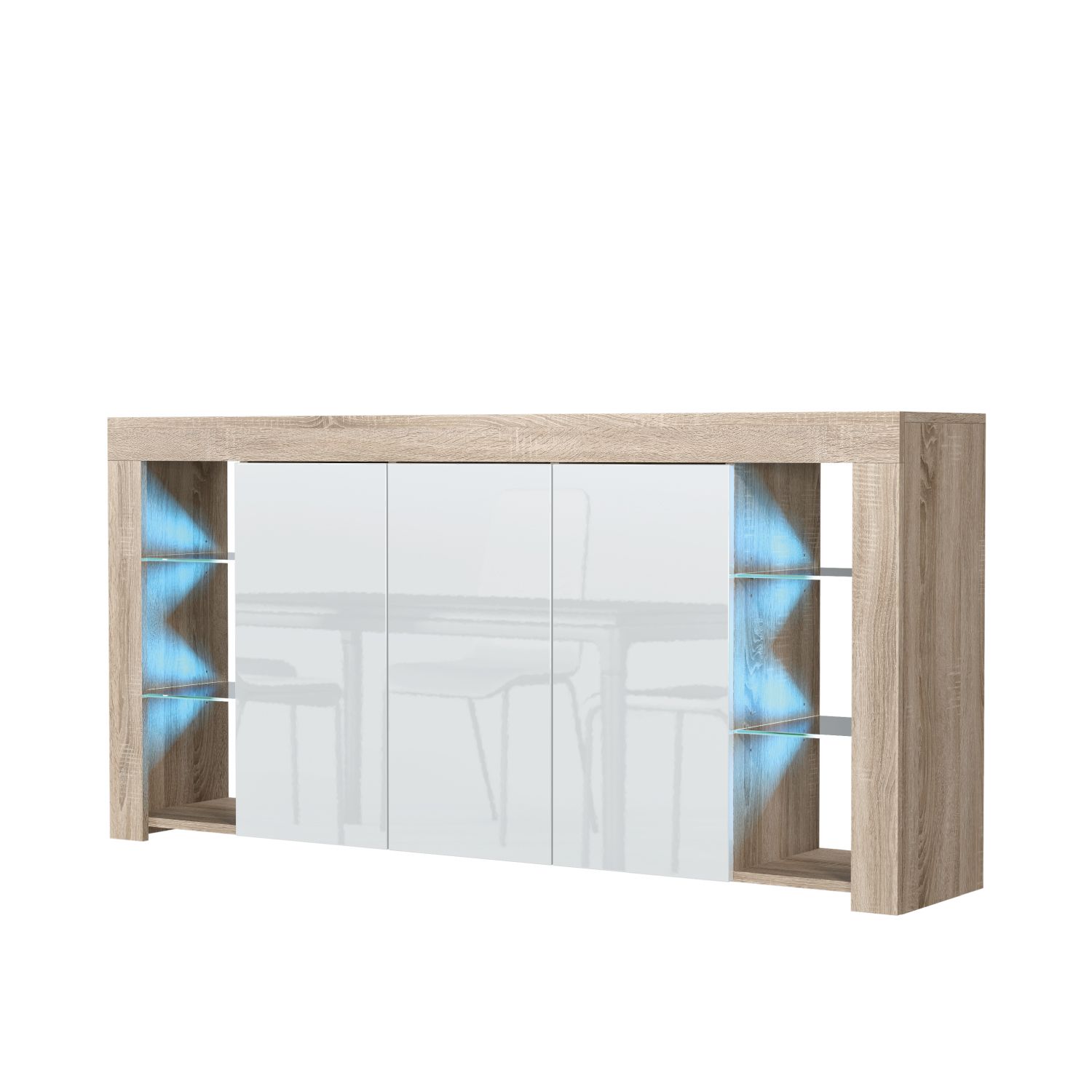 The BILBAO Sideboard combines contemporary design with functional storage, making it a sleek and elegant addition to your living space. Measuring 164cm (W) x 83cm (H) x 35cm (D), this cabinet offers ample storage and display options while enhancing the modern aesthetic of your home. The matte-finished body is complemented by glossy push-to-open doors, creating a clean and minimalist look that suits any interior. Behind each of the three doors, a shelf divides the storage space into two compartments, providing plenty of room to keep your essentials neatly organized and out of sight. For displaying decor, books, or cherished items, the sideboard features six open compartments and four glass shelves, offering a stunning showcase that is beautifully enhanced by LED lighting included in the set. Please note: the Oak with Black version features matte black doors, offering a unique and understated alternative to the glossy finishes available in other options. Available in White & Gloss Doors, White & Grey Gloss Doors, Black & Gloss Doors, Walnut & Black Gloss Doors, Oak & White Gloss Doors, Oak & Black Matt Doors, and Dark Grey & Gloss Doors.