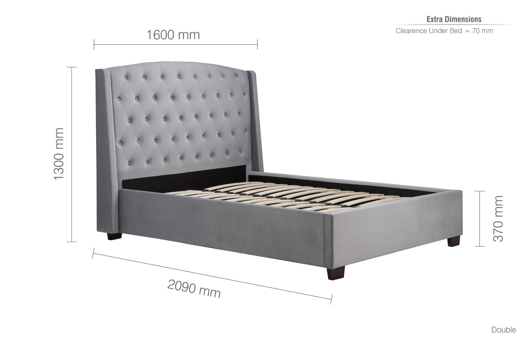 Make a grand style statement with this elegant contemporary bed frame. The Balmoral bed is upholstered in a luxurious grey velvet and features a wingback headboard with beautiful tufted detailing. Featuring a sprung slatted base to give natural bounce, this bed adjusts to where pressure is most exerted for greater comfort. Add a touch of elegance to any style bedroom with the Balmoral Bed! The maximum weight load for the 4′6 frame is 300 kg, the 5′ frame is 400 kg, and the 6′ frame is 450 kg. Please note: Birlea beds are only suitable for a UK standard size mattress and the recommended maximum mattress height is 3050 mm.