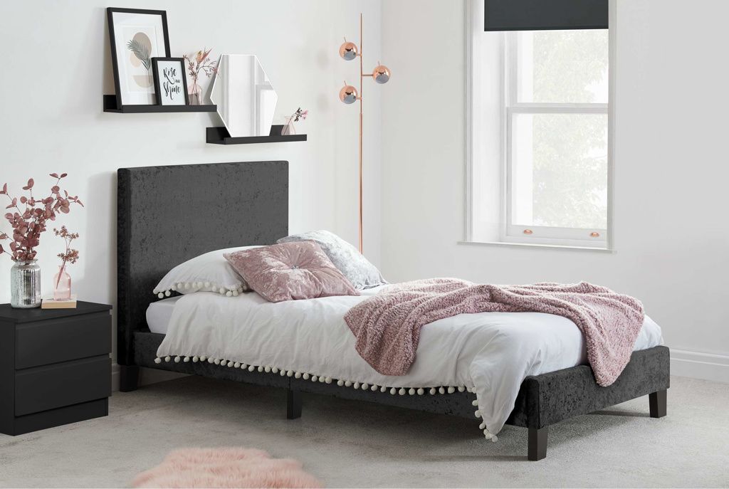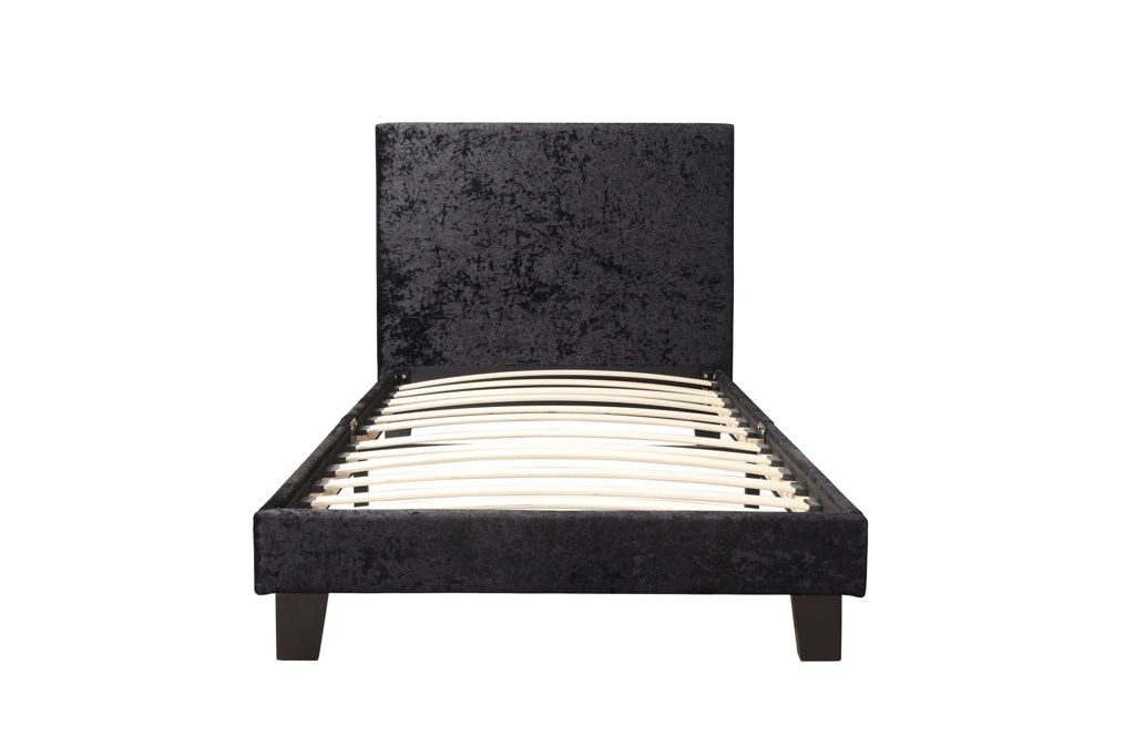 - This bed frame is upholstered in either grey fabric, steel or black crushed velvet.
