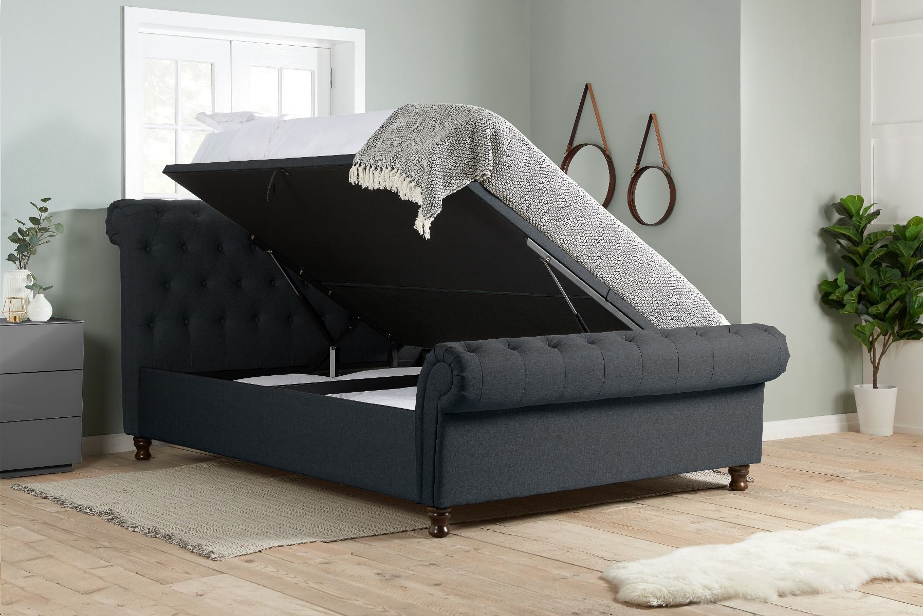 - The platform top ottoman base features gas lift arms which can be fitted to open on either the left or right-hand side of the bedstead giving you that extra flexibility
