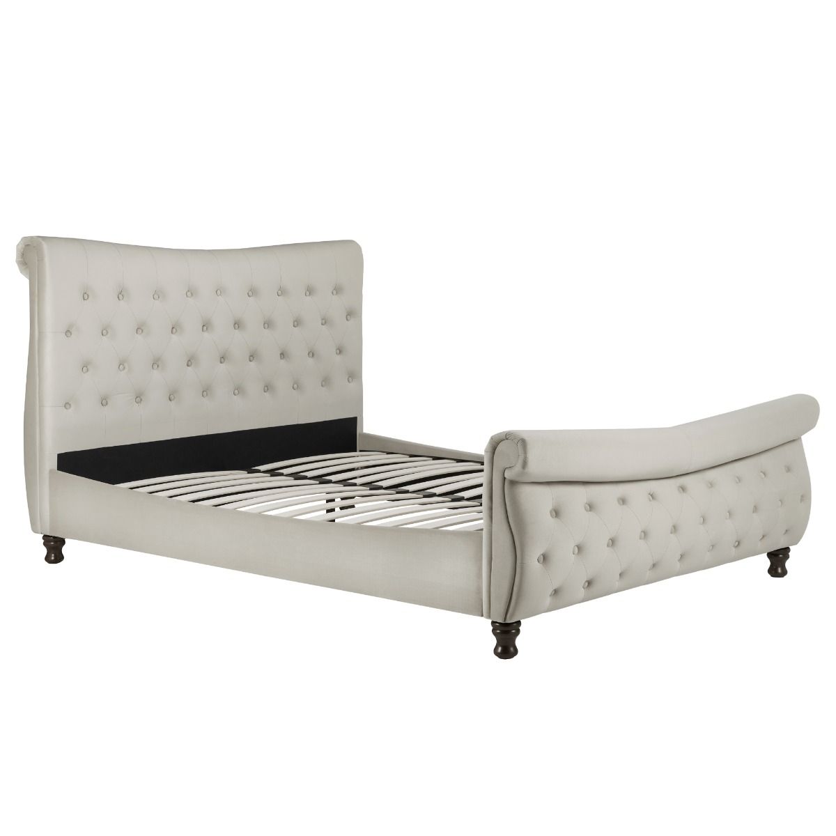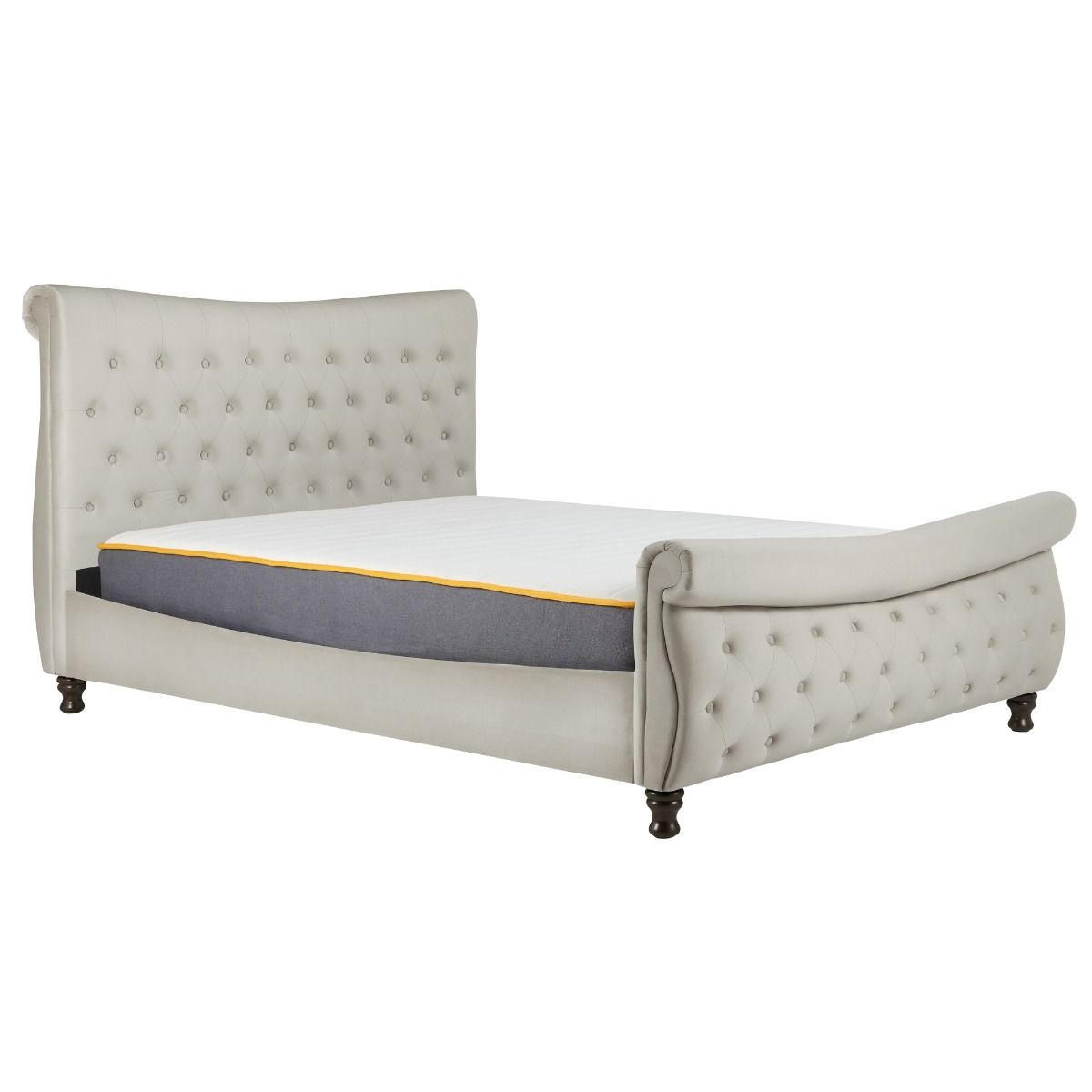 Made from luxurious fabric, the Copenhagen features a beautiful deep-diamond quilting headboard with matching foot end. This bed would be a perfect match for both traditional and contemporary bedroom settings. Upholstered in polyester with complementary dark wood feet, the Copenhagen is available in a Warm Stone finish. This frame has a sprung slatted base to give natural bounce, adjusting to where pressure is most exerted for greater comfort. The maximum weight load for the 5′ frame is 400 kg, and the 6′ frame is 450 kg. Please note: Birlea beds are only suitable for a UK standard size mattress and the recommended maximum mattress height is 3050 mm.
