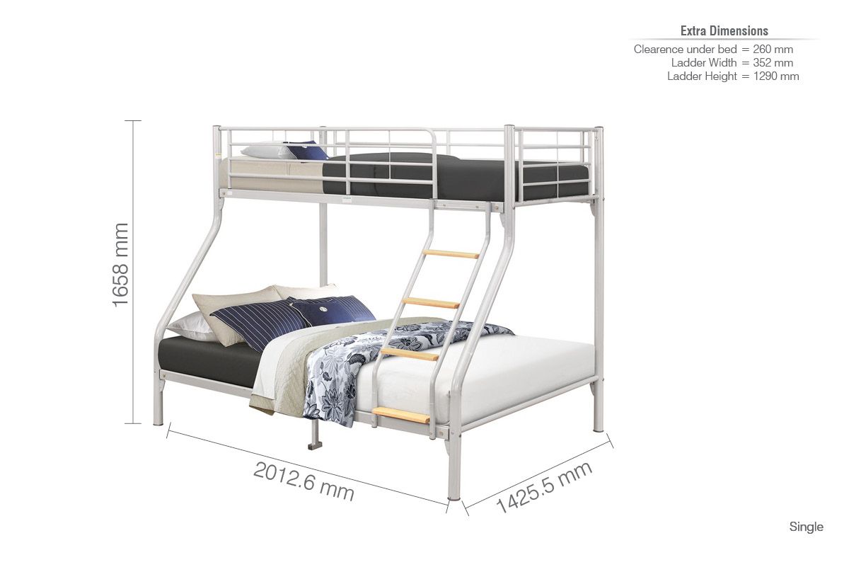 A bed with a difference, the Nexus offers a sleeping solution for three, great fun for the children. This is a steel frame, finished with an epoxy powder coated paint process and is available in silver. This frame also features beech coloured rubberwood post caps and ladder steps. The top sleeping bunk has a 3′ sleeping area, whereas the bottom bunk offers a 4’6 sleeping space. Both bunks have steel mesh bases to provide firmer support and allow air to circulate the mattresses. The maximum mattress height for the top bunk is 200mm. The Nexus top frame is suitable for children only.