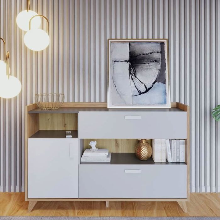 With its modern and elegant design, our Bitternut sideboard is perfect for any modern or contemporary decor. Distinctive features include one hinged door, one open compartment, two shelves and a pair of spacious drawers that provide ample storage space. Finished in a gorgeous combination of colours and made from 16mm laminated board, the cabinet enjoys an abrasion-resistant, incredibly robust carcass.