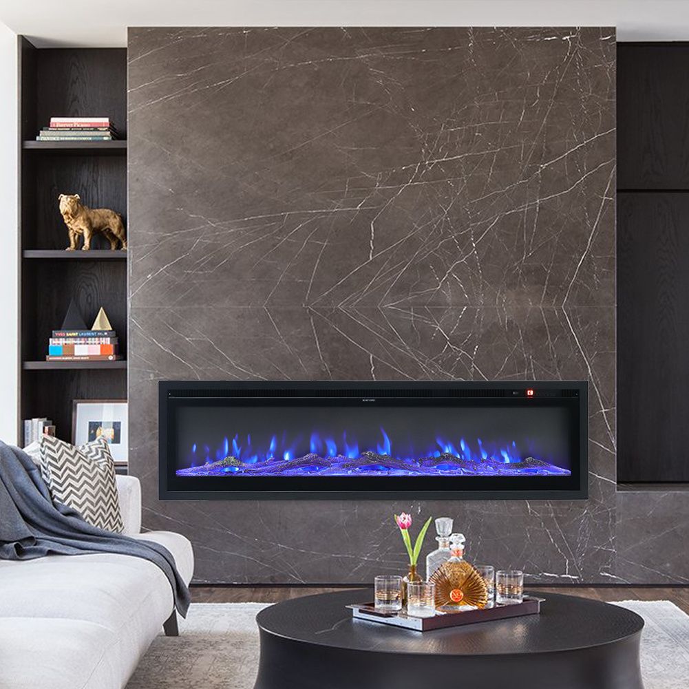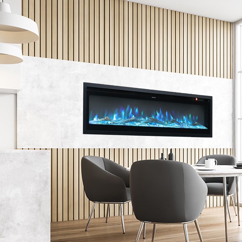 Indulge in the mesmerizing dance of lifelike flames with our electric fireplace. Effortlessly adjustable, it offers a spectrum of hues and intensities to match your mood. Whether recessed for a sleek finish or hung with elegance, it's a beacon of warmth and style. Includes floor stands for versatile placement.