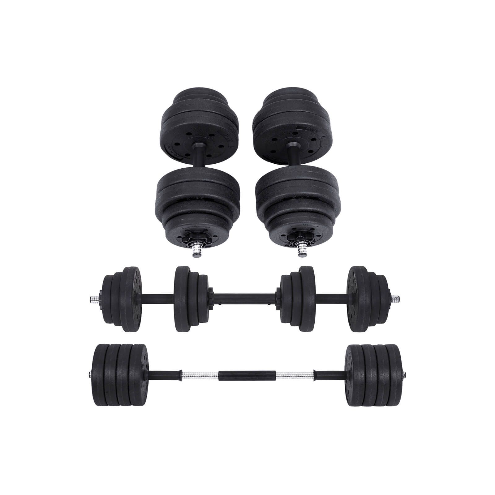 Package Contents: - 8 x 2.5 kg Plate - 4 x 1.25 kg Plate - 4 x 1 kg Plate - 2 x Bar - 4 x Spinlock - 1 x Barbell Bar