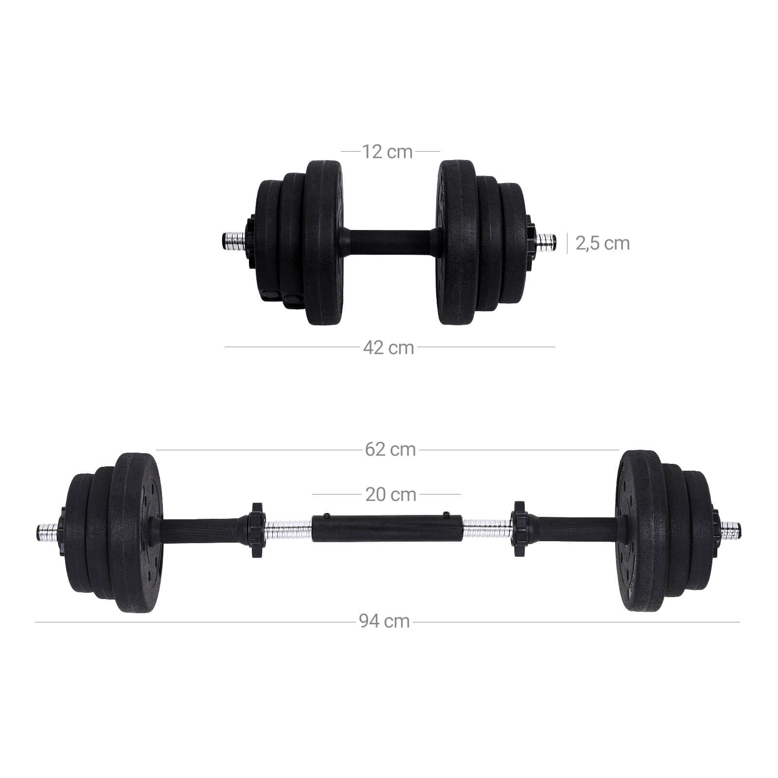 always provides the best fitness accessories for those who are building towards their ideal body shape. Our brand new dumbbell set was made to bring you the optimal exercising experience without any restrictions of time and space. It allows you to: Personalize your own workout routine: Various plates make it easy for you to adjust the weight by simple combination according to different training intensity, save you money and space for extra weight settings. Effortlessly transfer to the barbell: With the specially included barbell connection tube, you can get a barbell at the blink of an eye. It offers you more choices to build up the muscles of different body parts, thus achieve a better training result. Recommended Free Combination: 10 kg: 4 x 1.25 kg, 4 x 1 kg, 2 x iron bar, 4 spinlock 16 kg: 4 x 2.5 kg, 4 x 1.25 kg, 2 x iron bar, 4 spinlock 20 kg: 4 x 2.5 kg, 4 x 1.25 kg, 4 x 1 kg, 2 x iron bar, 4 spinlock 26 kg: 8 x 2.5 kg, 4 x 1.25 kg, 2 x iron bar, 4 spinlock 30 kg: 8 x 2.5 kg, 4 x 1.25 kg, 4 x 1 kg, 2 x iron bar, 4 spinlock