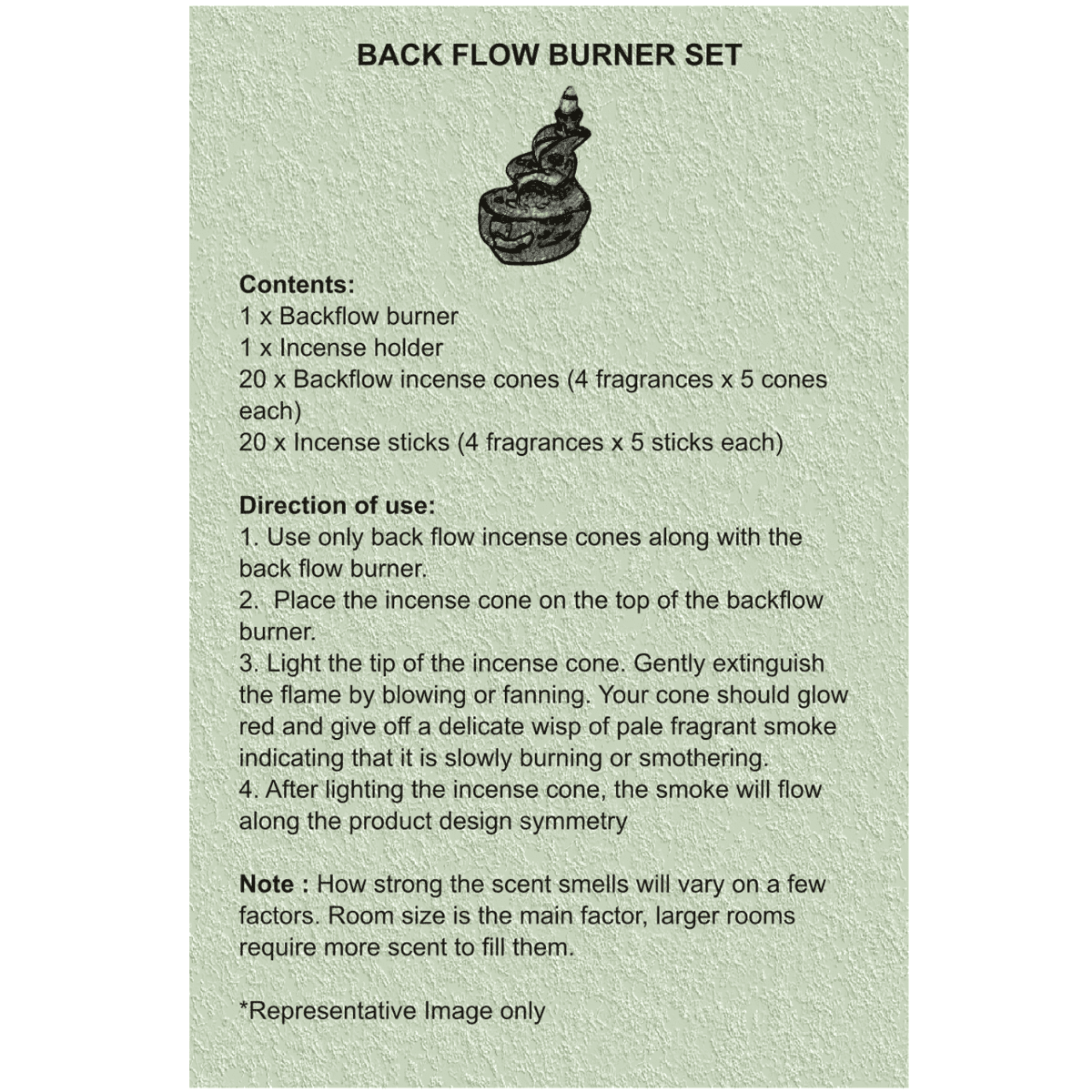 - 1x Backflow Burner, 1x Insence Holder, 20x Backflow Cones & 20x Incense Sticks