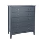 This 5 drawer chest features a "midnight" dark blue/ paint finish, complimented with tapered legs, real metal handles and easy glide drawers