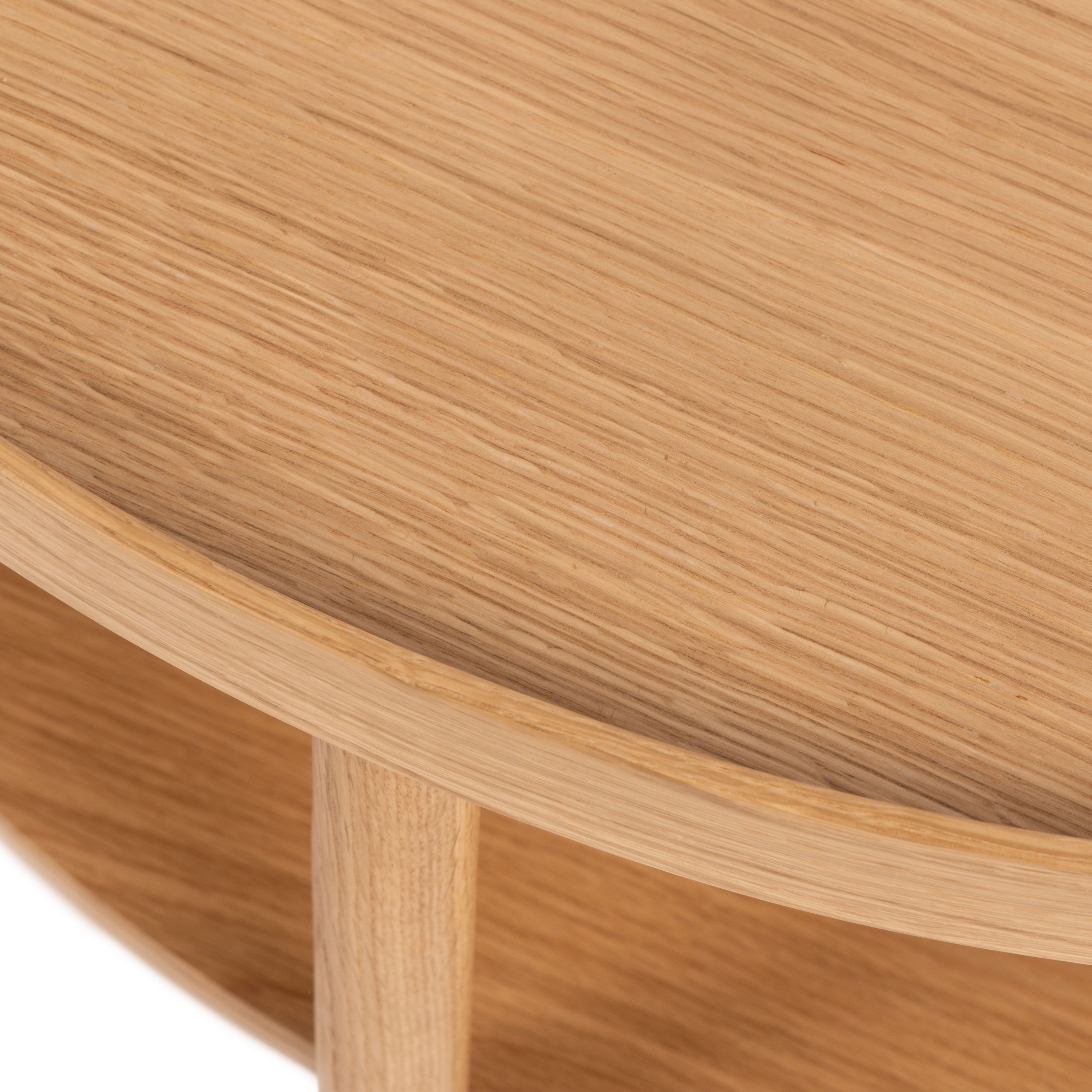 The BOLD round coffee table combines timeless design with practical functionality. Featuring a two-tiered structure, it boasts an oak PU lacquered veneer top and shelf, complemented by a sturdy NC lacquered oak base. Its 80x42 cm size is ideal for both traditional and modern living rooms, while the round top with a raised edge adds a refined touch. Perfect for keeping essentials within reach, this table blends style and utility effortlessly.