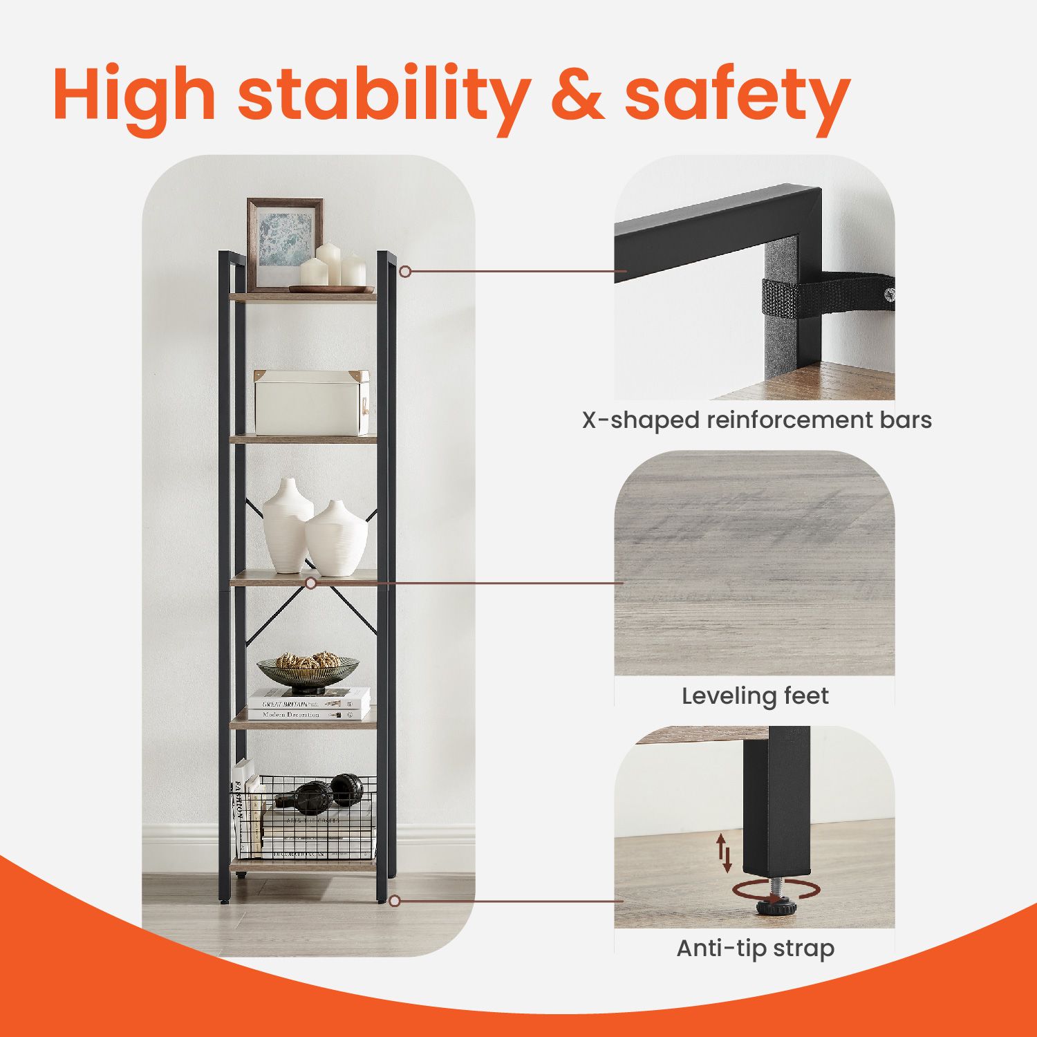 Organize your space with this stylish 5-Tier Storage Shelf. Perfect for home offices or living rooms, this freestanding bookcase offers ample storage for books, decor, and essentials. Its industrial, rustic brown and black design adds a touch of charm to any room.