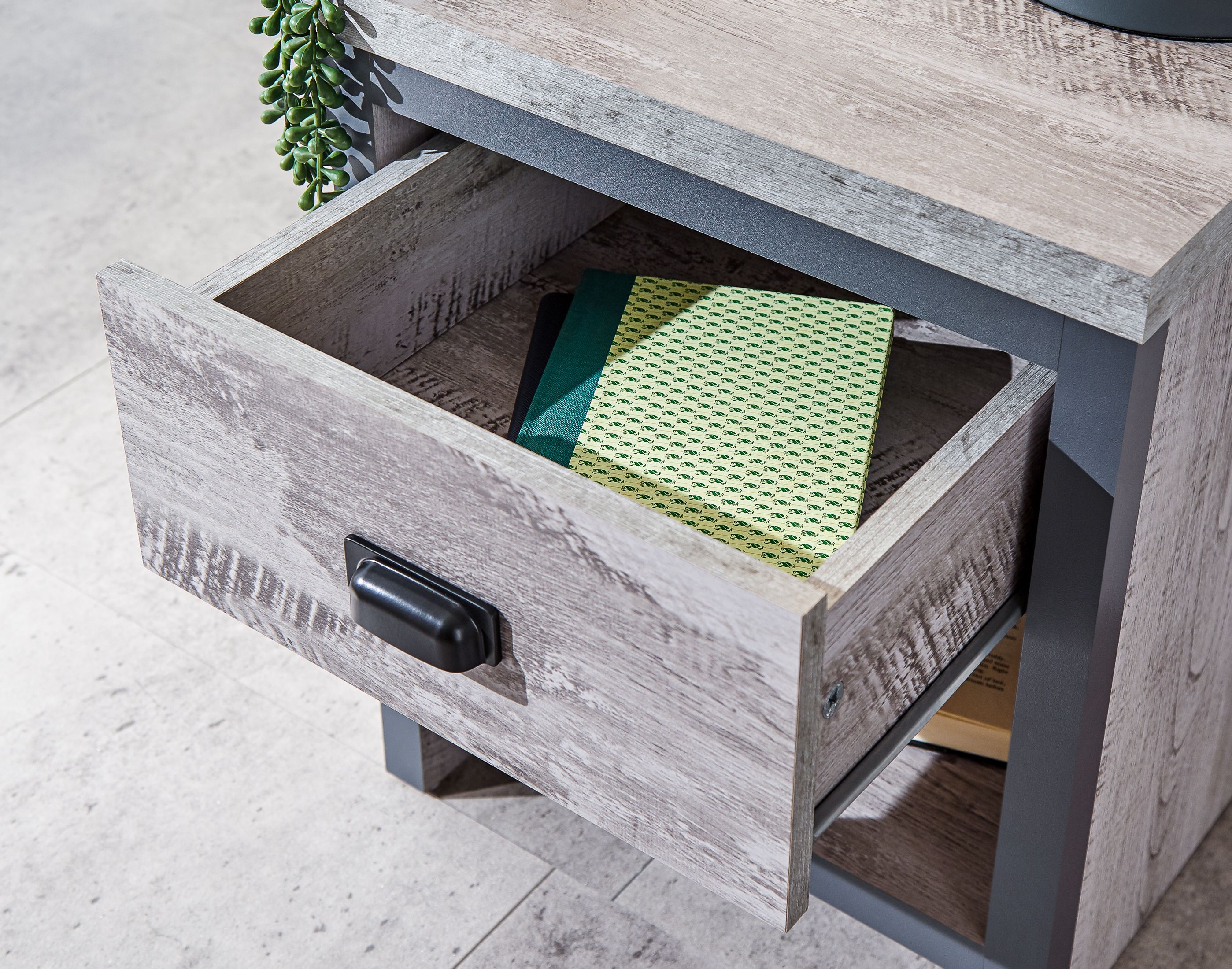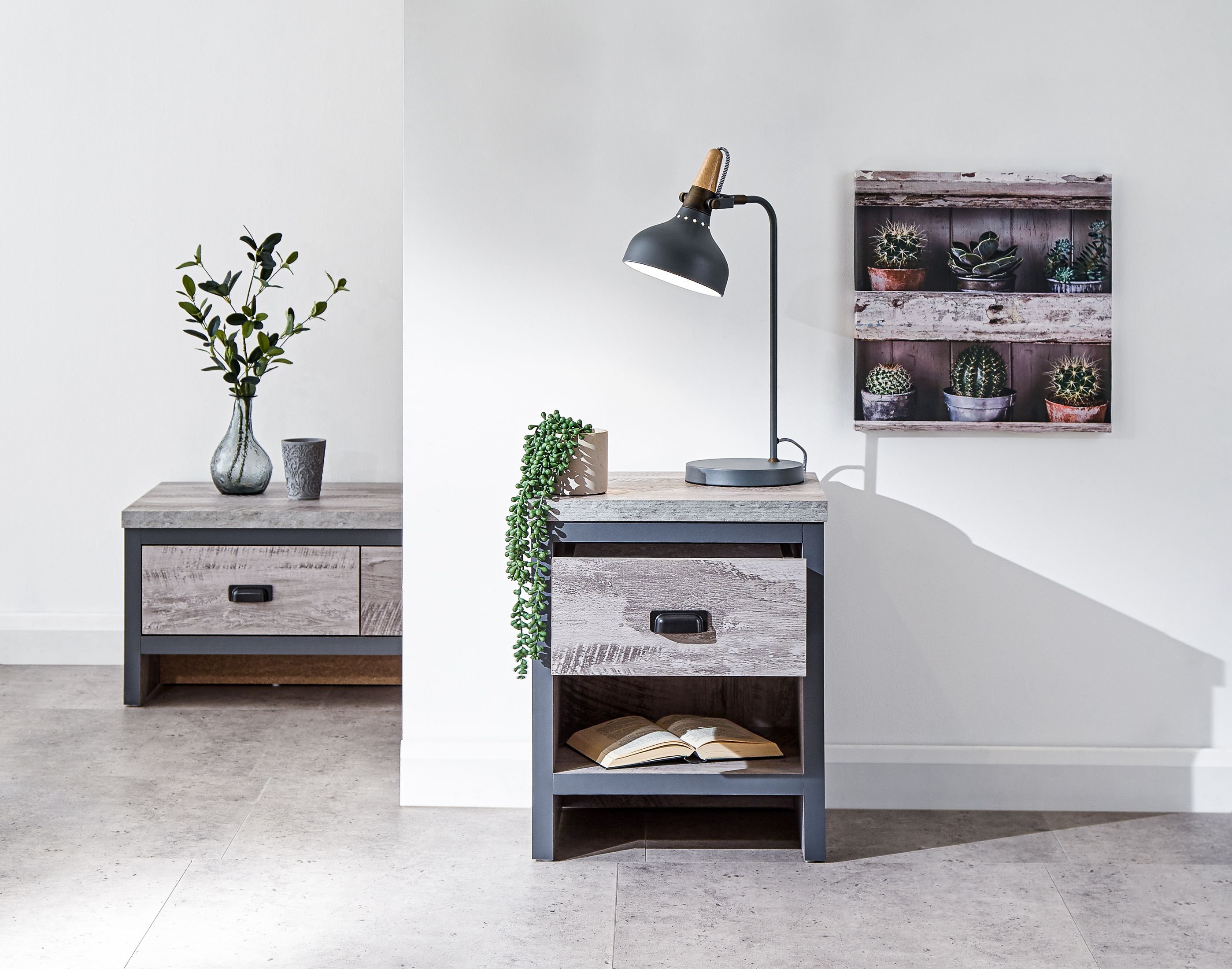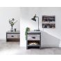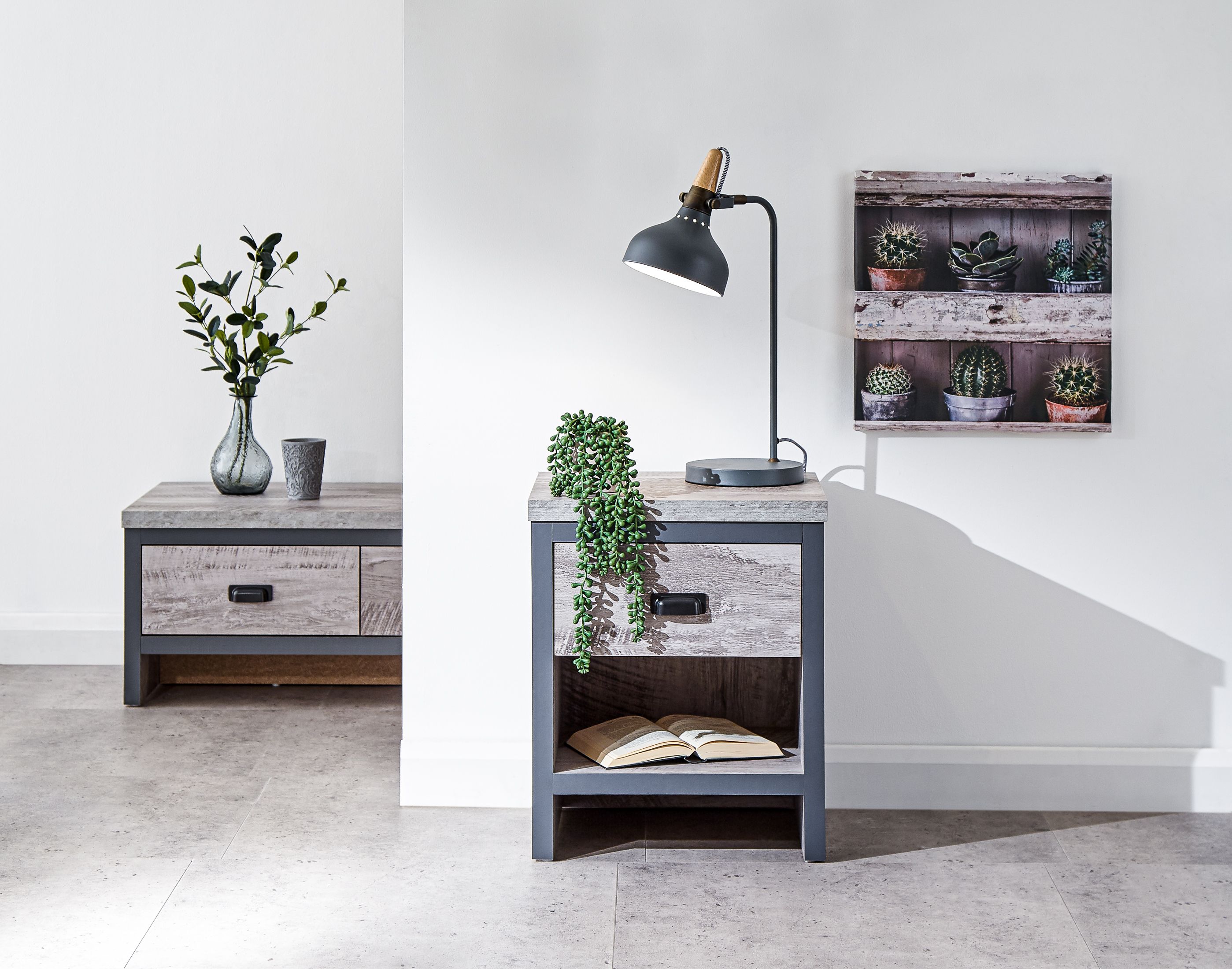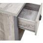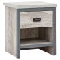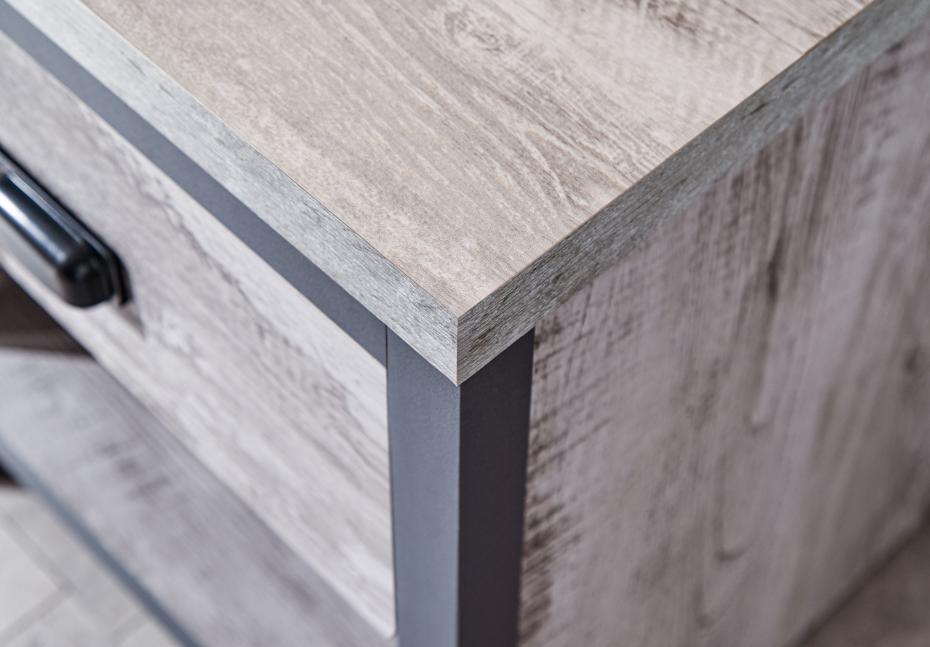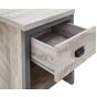 If youre looking for a contemporary addition to your living space, this industrial-inspired lamp table is the savvy choice. Designed to bring a splash of urban chic into your home, it impresses with its chunky construction and distressed finish in oak or grey. The simple, double-sided design means it can be placed anywhere in the room use it as an occasional drinks table or pair it with a smart lamp. Complete with deep drawer that has a matching wood-effect interior and 30mm thick top panel plus deep contrasting wooden casing.