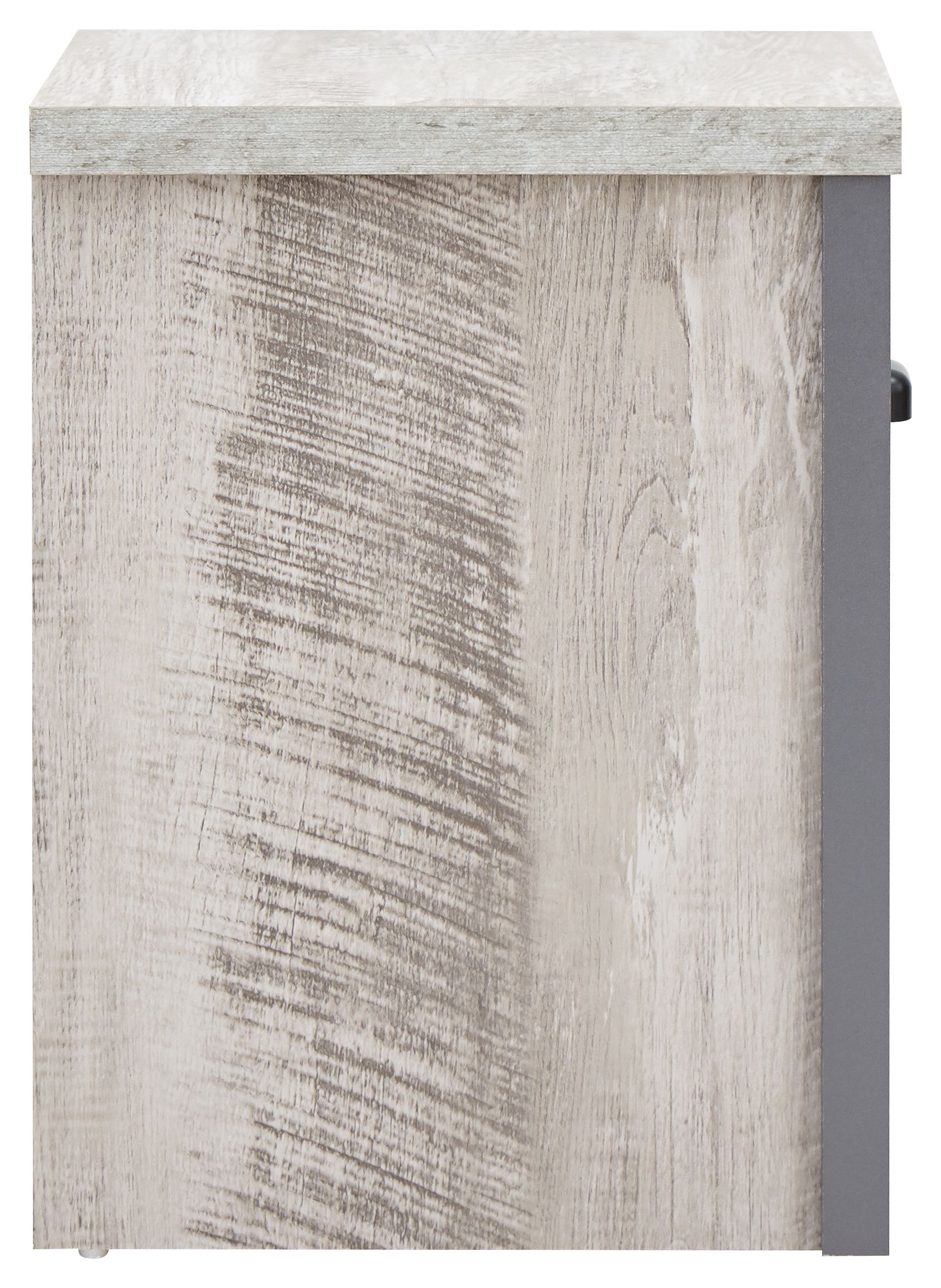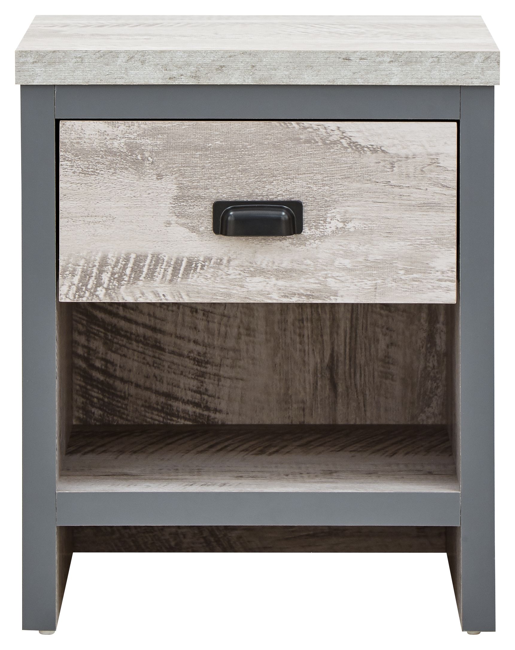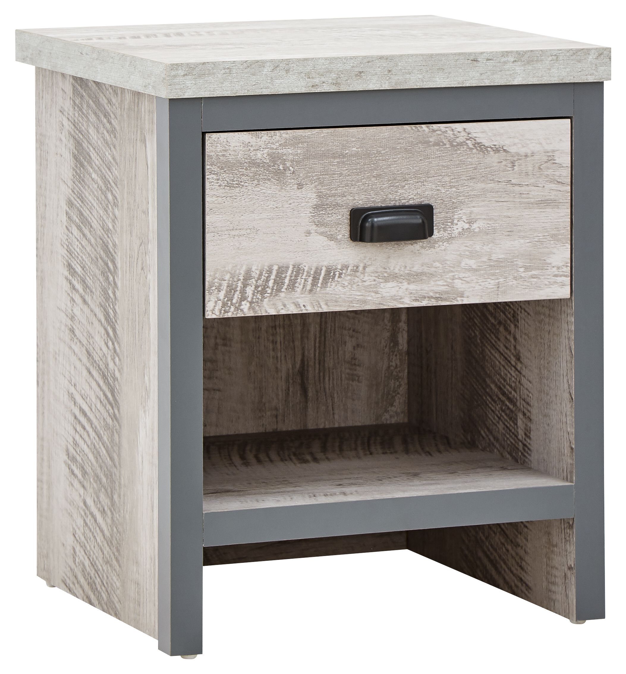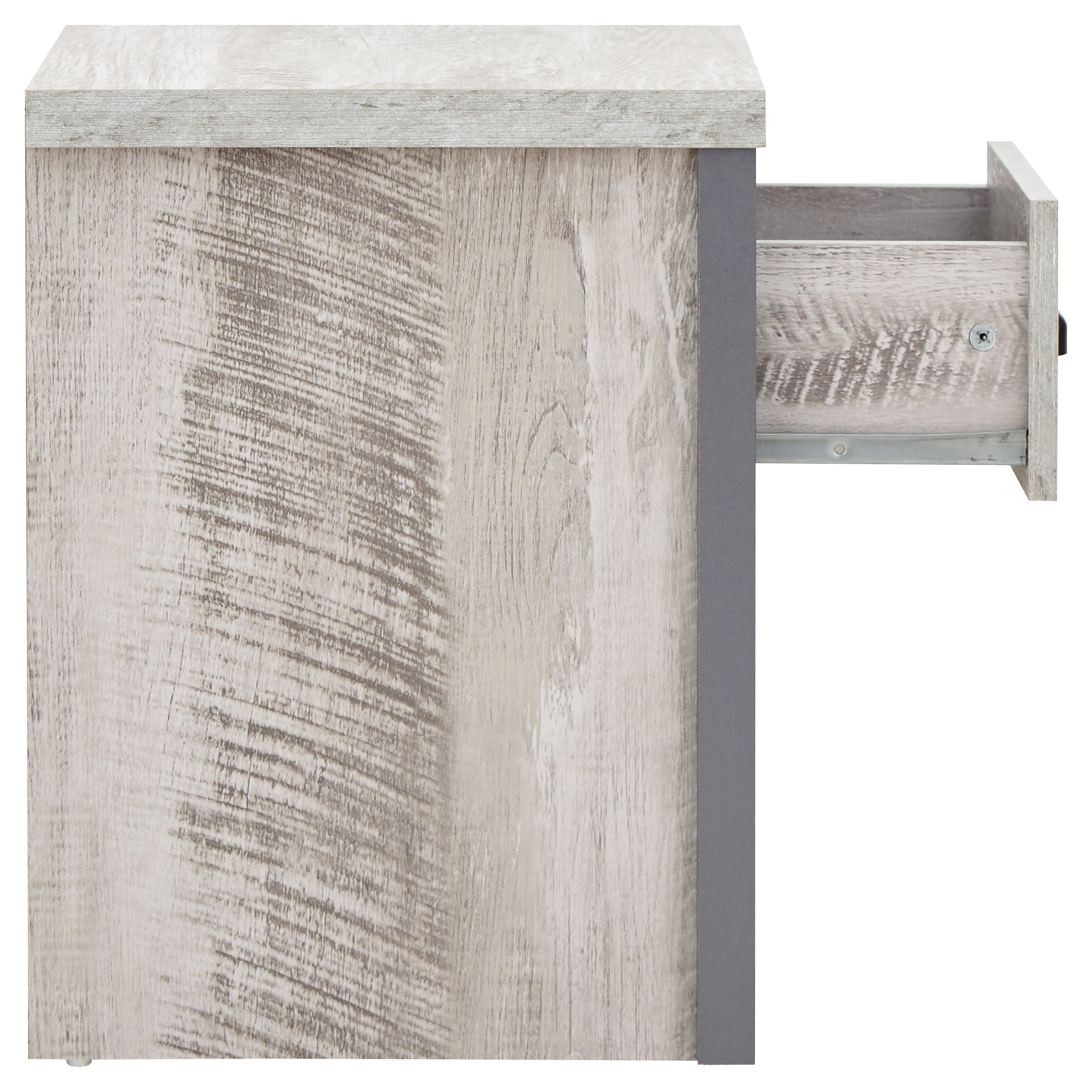 If youre looking for a contemporary addition to your living space, this industrial-inspired lamp table is the savvy choice. Designed to bring a splash of urban chic into your home, it impresses with its chunky construction and distressed finish in oak or grey. The simple, double-sided design means it can be placed anywhere in the room use it as an occasional drinks table or pair it with a smart lamp. Complete with deep drawer that has a matching wood-effect interior and 30mm thick top panel plus deep contrasting wooden casing.
