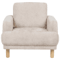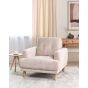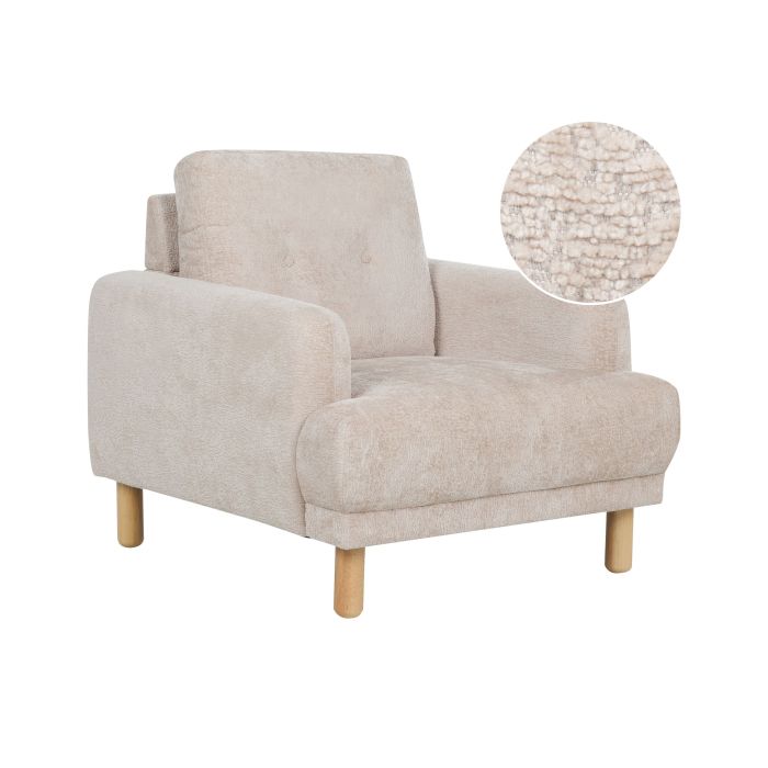 This upholstered armchair is going to be a focal point of your living space. Crafted out of durable, high quality bouclé fabric, in timeless beige colour, the piece will draw attention with its clean-lined design, thickly padded seat and buttoned backrest cushion. Additionally, the whole construction is placed on a set of wooden legs, which will highlight the retro design of the piece and guarantee stability. Details: Color: Beige, Light Wood. Main material: Boucle. Additional material: Rubberwood, Eucalyptus Wood. Material Composition: 100% Polyester Weight: 30 Assembly: Partial Assembly Required Wood type: Hevea brasiliensis Wood Origin: China Weight Capacity: 150 Cushions Dimensions: 56x46x15 Padding Thickness: 20 Seat Height: 45