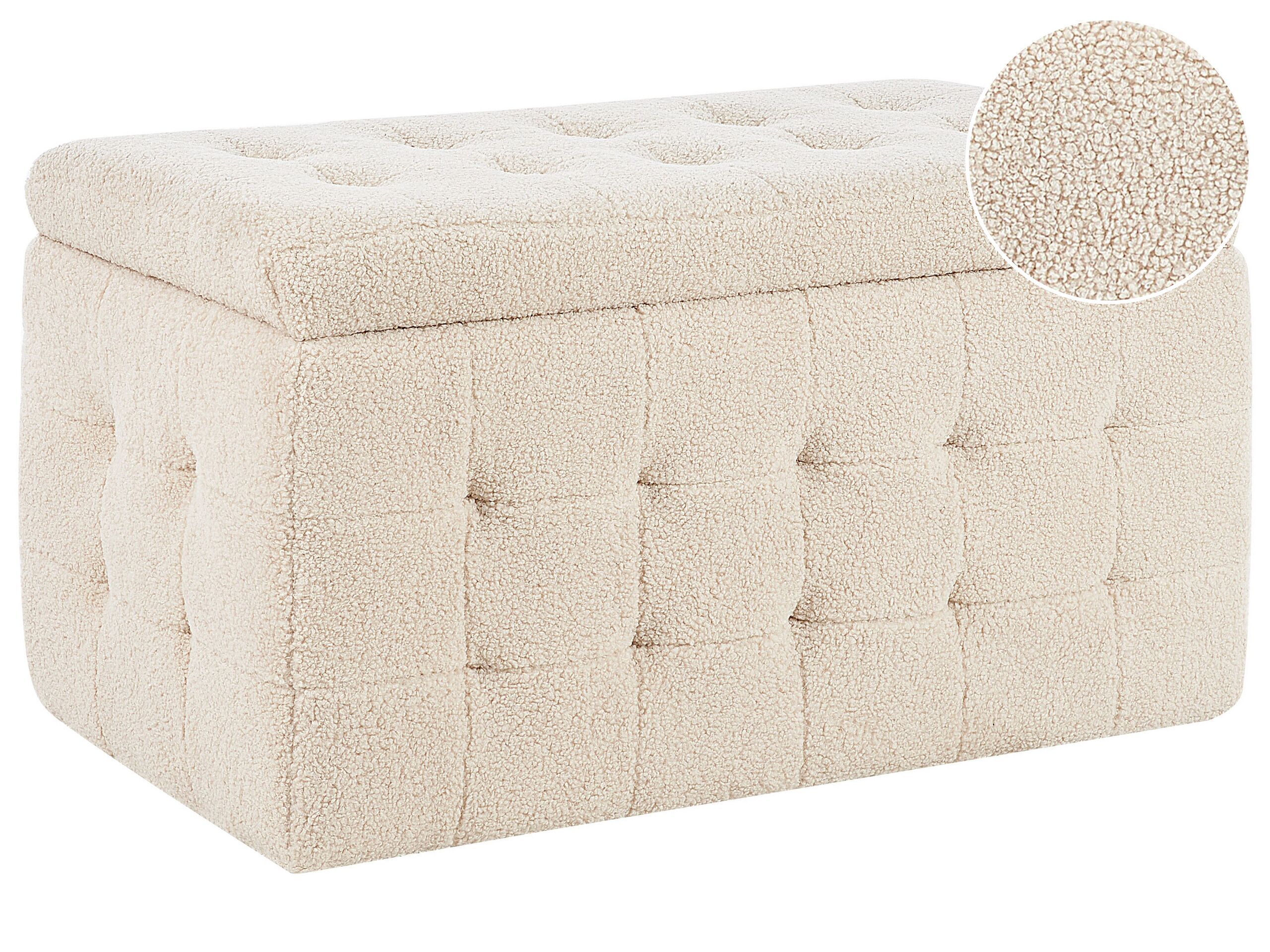 This ottoman is a statement piece that will enrich any interior. It is constructed from a robust medium density fibreboard with a thick foam padding and covered in boucle fabric. The ottoman has a hinged top and can be used as an additional storage piece or a footstool. Its classic button-tufted upholstery and trendy beige colour make this ottoman a striking piece of furniture. Details: Color: Beige. Main material: Boucle. Additional material: Synthetic Material, Polyester. Material Composition: 100% Polyester Weight: 9 Assembly: Does Not Require Assembly Weight Capacity: 80