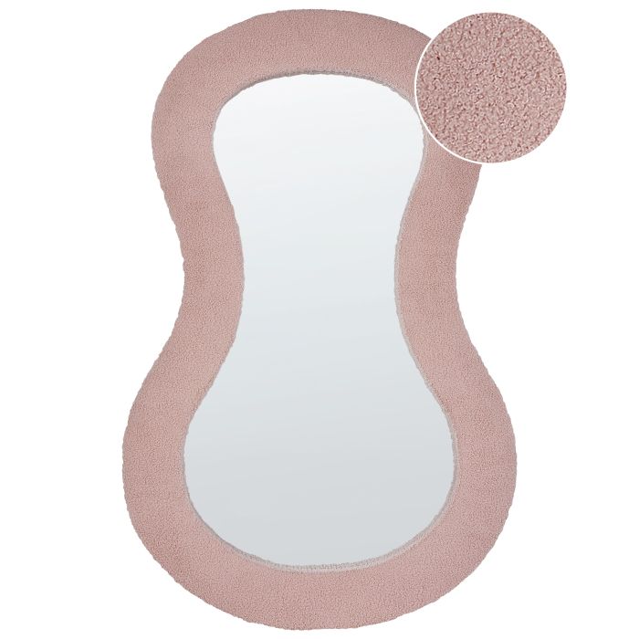 Elevate the look of your home with this mirror and enlarge the space visually with it. Handcrafted out of durable bouclé material, in soft, pink colour, the accessory will be a perfect addition to many different interior decor styles, from boho to contemporary ones. As it features hangers on its back, the piece can be quickly mounted on your wall. Its unique shape, combined with size and shade will definitely turn the heads of all your houseguests. Details: Color: Pink. Main material: Boucle. Additional material: MDF, Glass. Weight: 9 Assembly: Does Not Require Assembly
