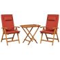 Sit comfortably and enjoy your morning coffee on the balcony with this practical bistro set. Made from high quality acacia wood, it makes a perfect match with virtually any setting thanks to the natural, light finish. The chairs and the table can be folded for easy storage when out of season. Besides that, the set is also equipped with thickly padded cushions for the chairs. The high quality fabric is easy to care for, while the seams are carefully finished and are almost invisible. Thanks to the UV and water resistant material used, the pillows are sure to last for many years, with the colour staying rich and adding style to your outdoor space.