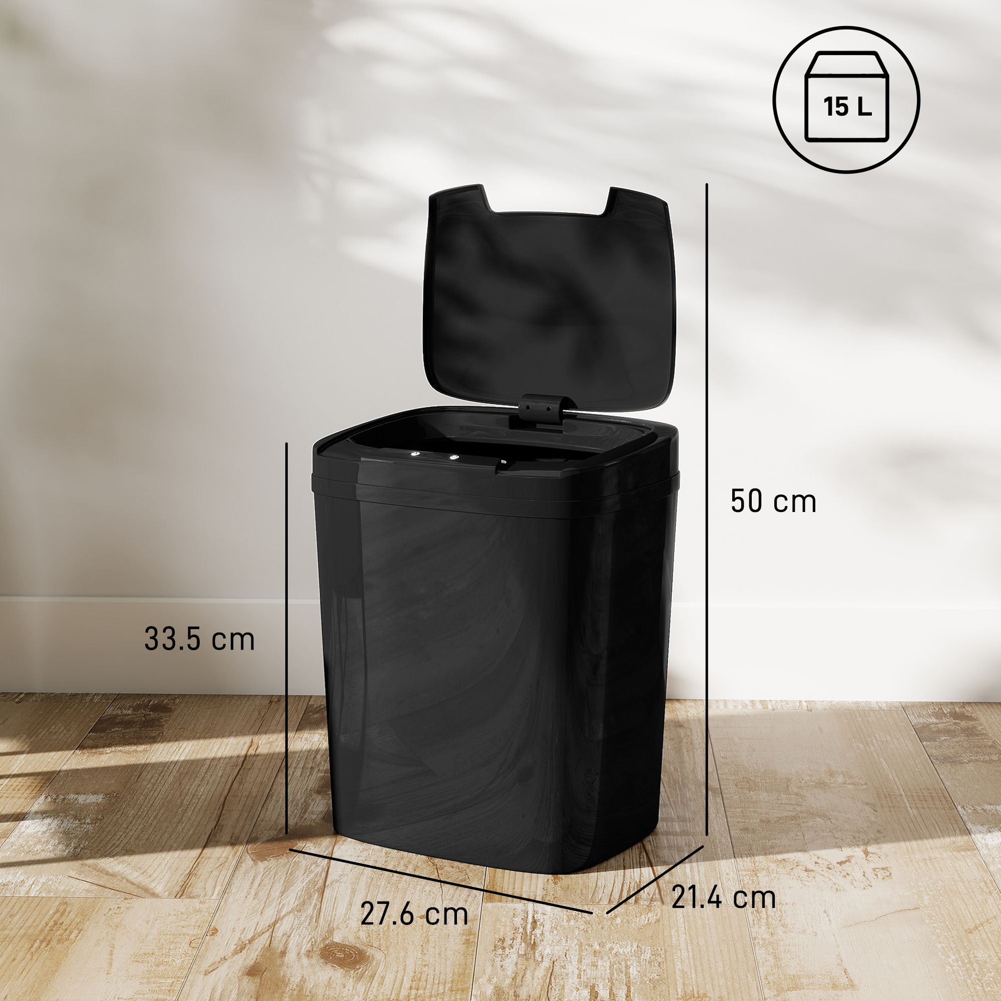 Overall Dimension: 27.6L x 21.4W x 33.5H cm, Opening Size: 23.5L x 13.5W cm, Capacity: 15 L, Sensing Distance: 15-20 cm