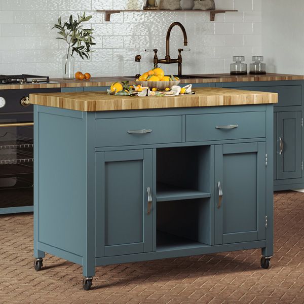 Introducing the newest addition to our Briley Kitchen Islands Collection, the Briley Kitchen Island with Butchers Block in Blue. Crafted for both functionality and elegance, this island boasts a symmetrical design with a butchers block top, providing ample workspace for culinary endeavors. Equipped with braked wheels for mobility, it features two drawers extending through the island, each partitioned for convenient organization, and two large storage cupboards for keeping kitchen essentials within reach.