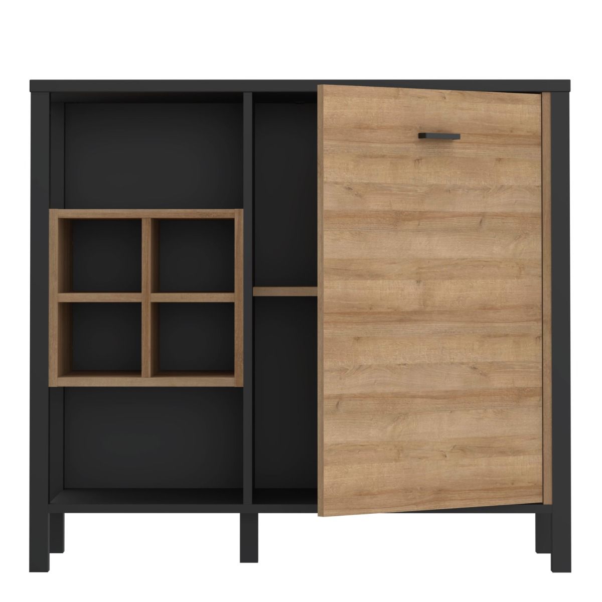 Broxtowe, a captivating and contemporary collection which has a perfect blend of the Riviera Oak decor with deep black accents, this collection immediately captivates attention with its originality. The sleek black metal handles add a touch of elegance, while the tables boast robust metal legs in a frame-like design, contributing to a distinct loft character within the space.