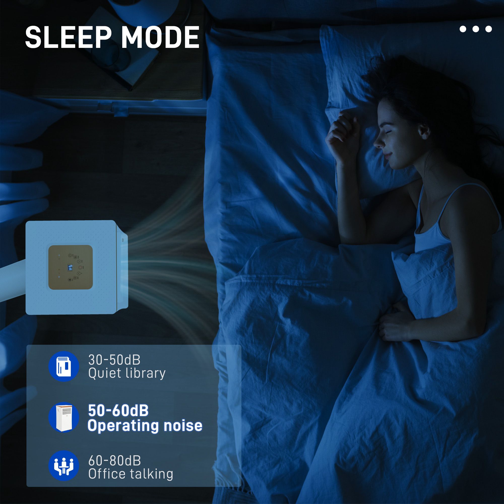 'Cool' keeps the area at a constant temperature, 'ventilate' controls the speed of the fan, 'dehumidify' dries out the moisture in the air and 'sleep' gradually increases the temperature by 1 °C every hour.