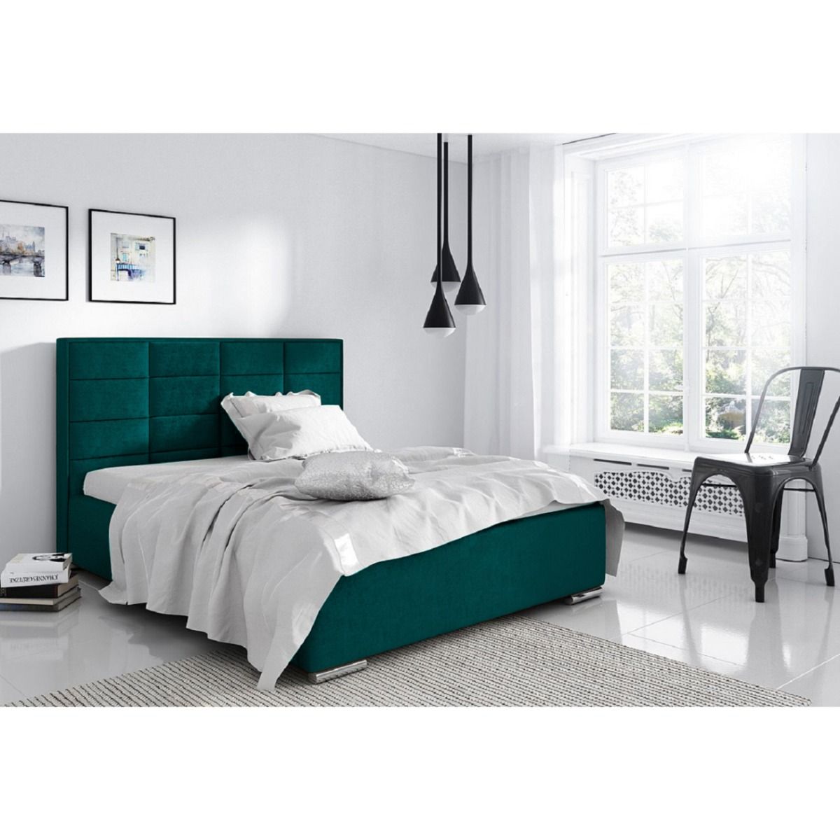 A fabulous looking bed frame with a strong design, an elegant cubed style headboard and plain footboard give this bed the ultimate contemporary look. Handmade in the UK with a beautiful plush velvet fabric. Comes with solid wooden slats and chrome metal feet