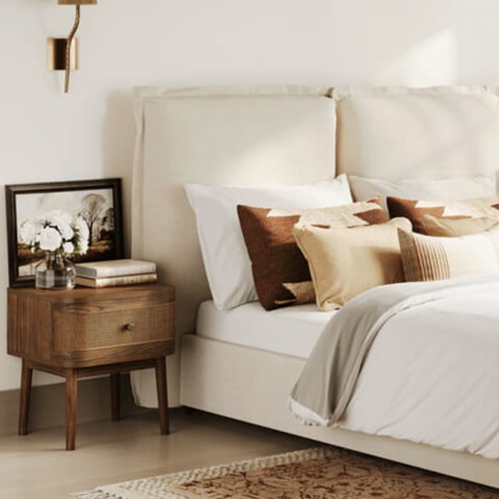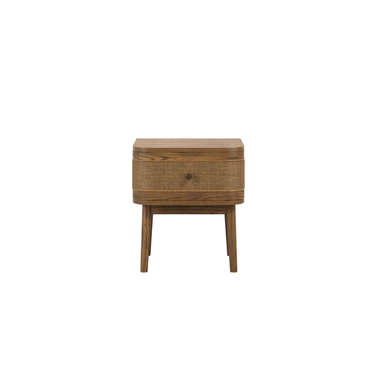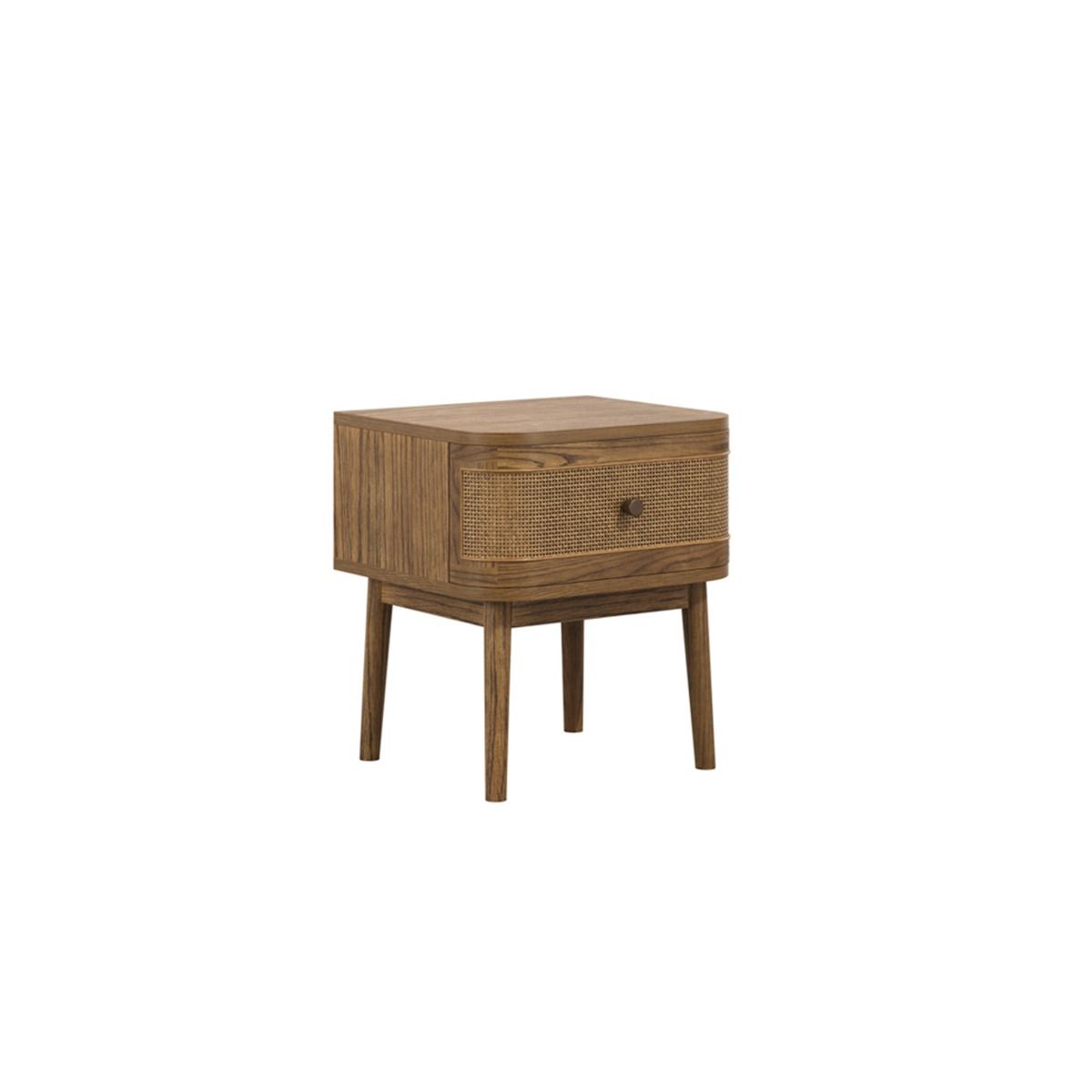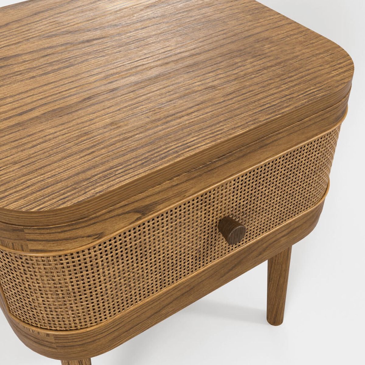 The CALEN bedside cabinet features a single drawer with a smoked wooden frame and a stylish weave front, offering a blend of texture and elegance for your bedside.