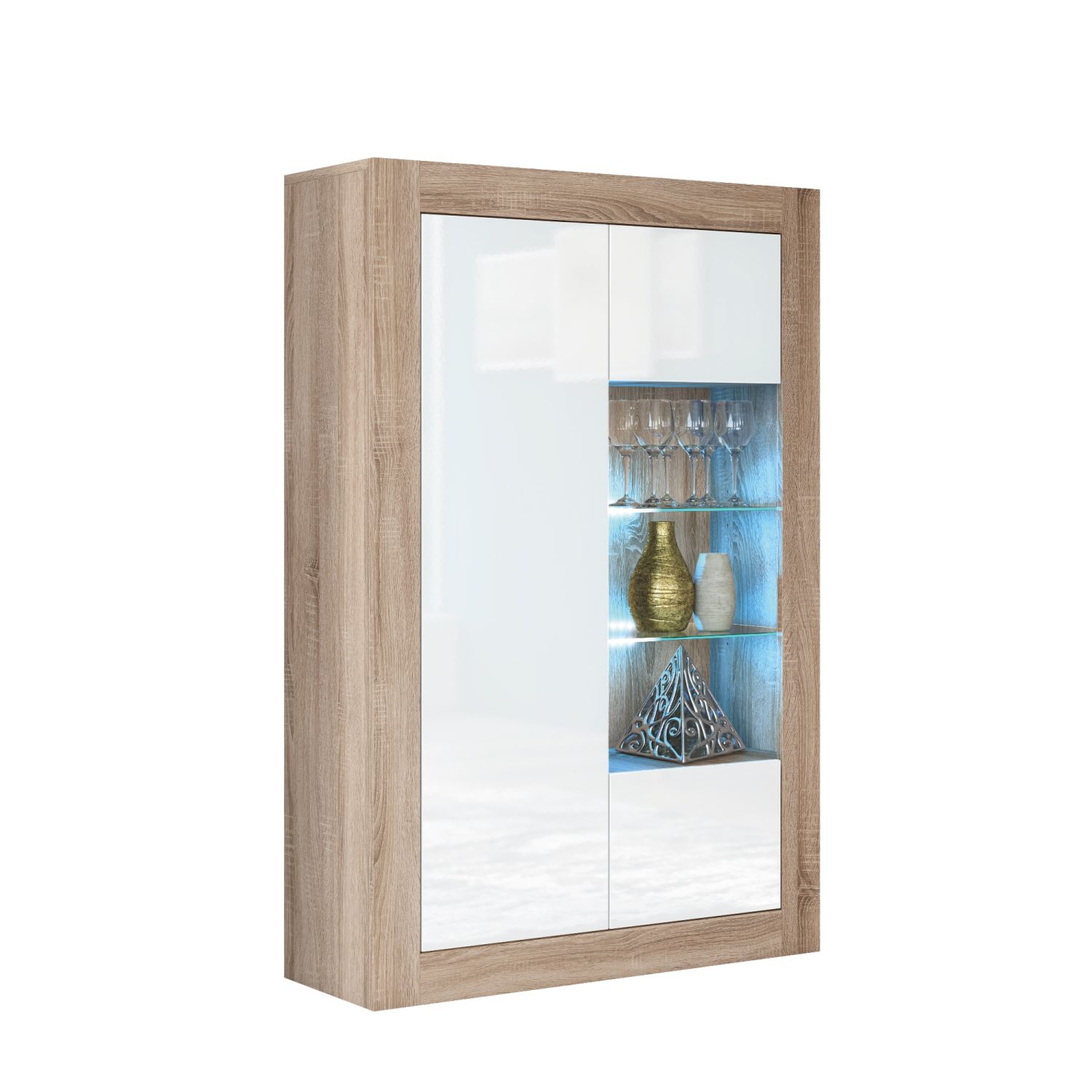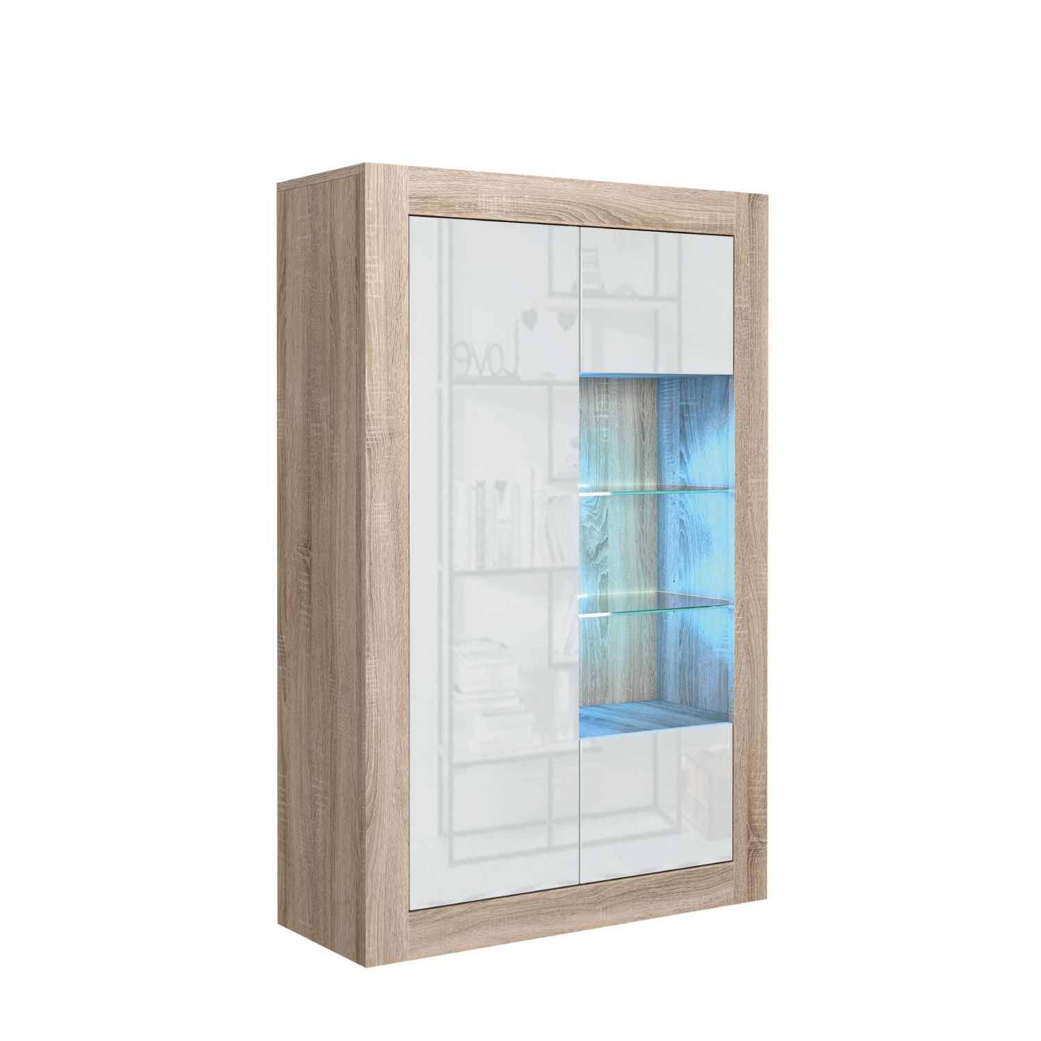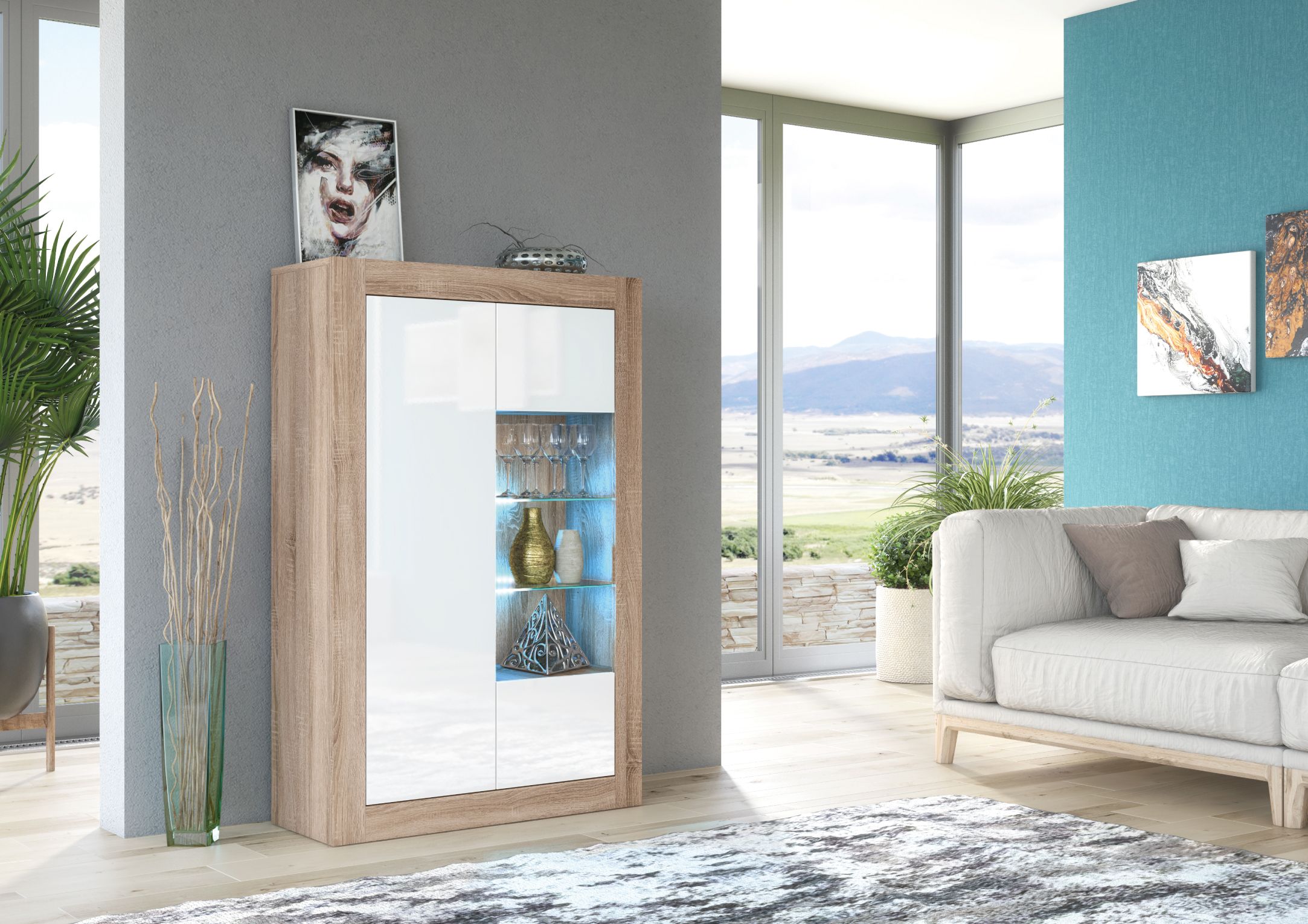 The CANNES Display Cabinet combines modern design with practical storage, making it a stylish and functional addition to any contemporary home. Measuring 93cm (W) x 140cm (H) x 35cm (D), this cabinet is crafted from durable 16mm chipboard and MDF, ensuring long-lasting quality and a sleek, sophisticated aesthetic. The matte-finished body is paired with glossy doors, creating a striking contrast that enhances any interior. Featuring three push-to-open doors, the cabinet offers discreet concealed storage, with the smaller doors revealing additional compartments and the larger door opening to a spacious area with four internal shelves, ideal for organizing and displaying your cherished items. At the center, three open compartments with two glass shelves provide a stunning display area for decor, books, or collectibles. LED lighting included in the set adds a warm and inviting glow, beautifully highlighting your favorite pieces and enhancing the ambiance of your space. Available in White & Gloss Doors, White & Grey Gloss Doors, Black & Gloss Doors, Oak & White Gloss Doors, and Dark Grey & Gloss Doors, the CANNES Display Cabinet is the perfect blend of style and functionality for your modern living space.