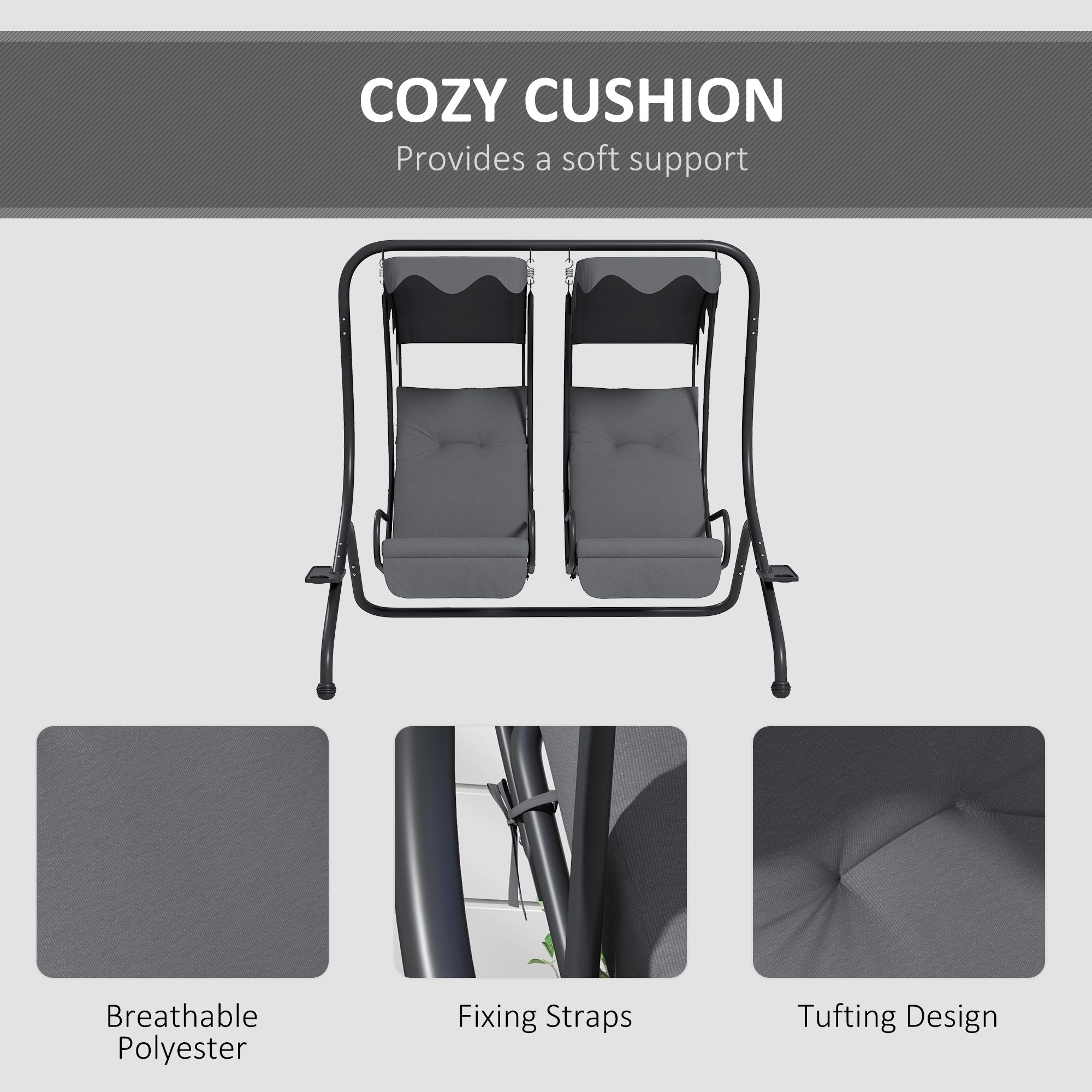 Canopy Swing Chair Modern Garden Swing Seat Outdoor Relax Chairs w/ 2 Separate Chairs, Cushions and Removable Shade Canopy, Grey