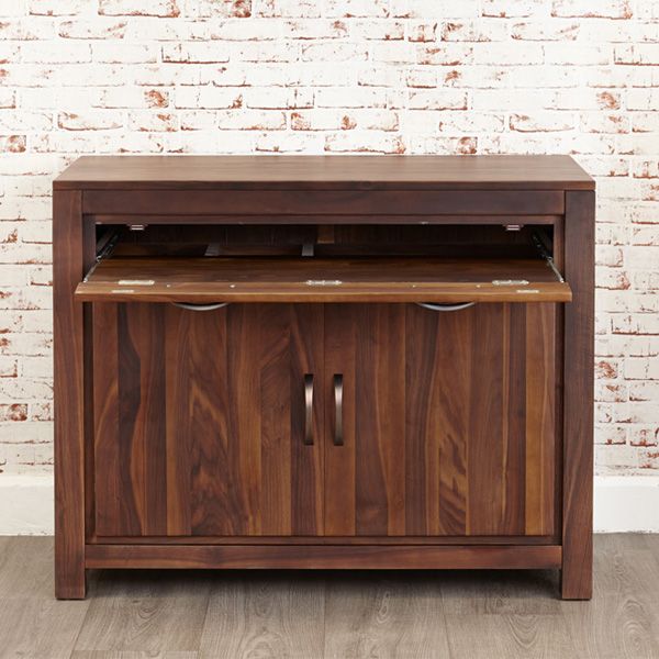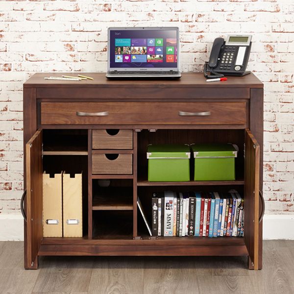 - Hidden upper drawer with hinged front for discreet keyboard and mouse storage.