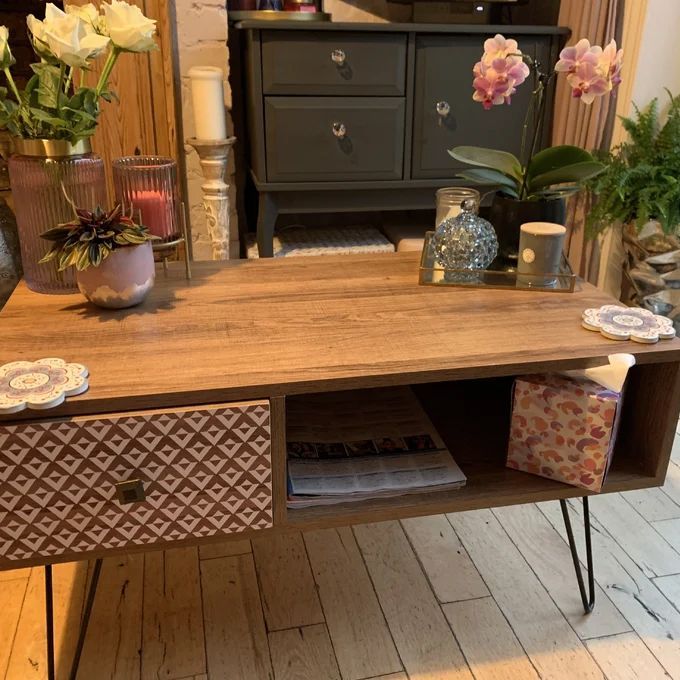 The Casablanca Coffee Table stands on black wired legs and contains one drawer and one shelf space to conveniently hide all your bits and bobs in your living space. The Coffee Table is constructed from particle board with a wood effect finish.