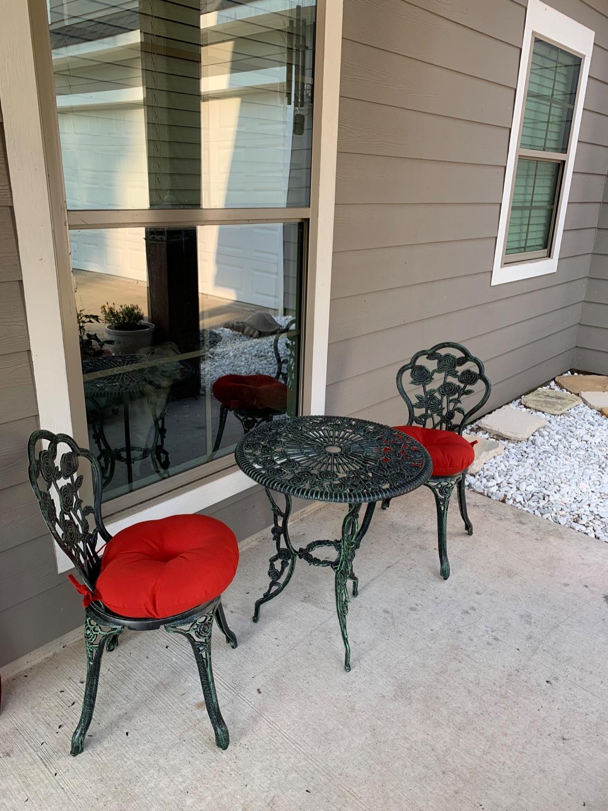 - 3-PIECE BISTRO SET: This 3-piece bistro set includes1 table and 2 vintage style chairs to grace your patio, balcony, porch, or front and back yard.