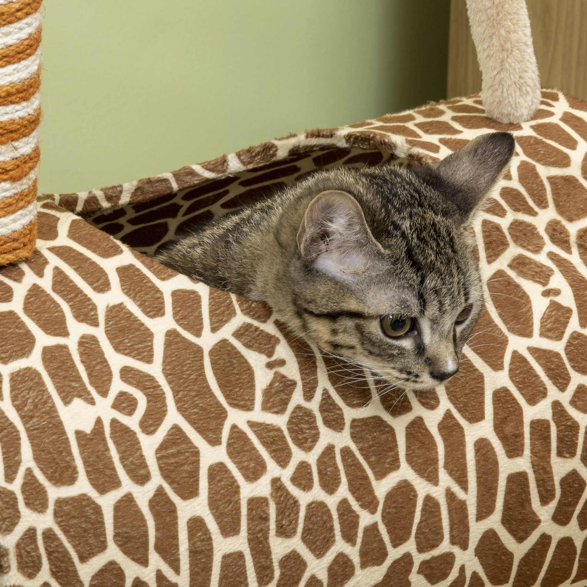 This cat tree from includes scratching posts, tunnel and ball toy for releasing energy, relaxing, or satisfying the urge to scratch. The cute giraffe design makes it a great addition to your home. Made of sturdy particle board for stability and the tunnel is covered in soft fabric for comfort. The jute scratching posts allow cats to maintain the sharpness and health of their claws. When they're feeling playful, the hanging ball keeps them entertained, especially when they're alone.