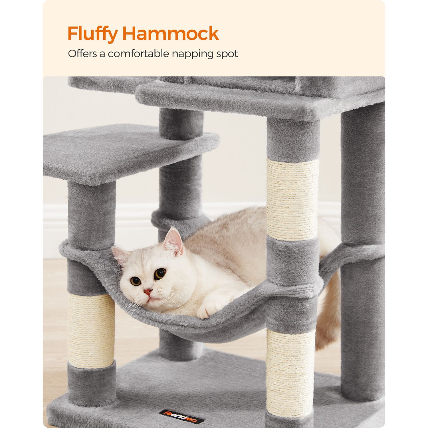 Introducing our Cat Tree with Hammock in a chic light grey finish. This stylish and functional cat tree features a cozy hammock for your feline friend to lounge in. Crafted with durable materials, it includes scratching posts and perches for play and relaxation. Treat your beloved cat to the ultimate comfort and entertainment with this practical and stylish addition to your home.