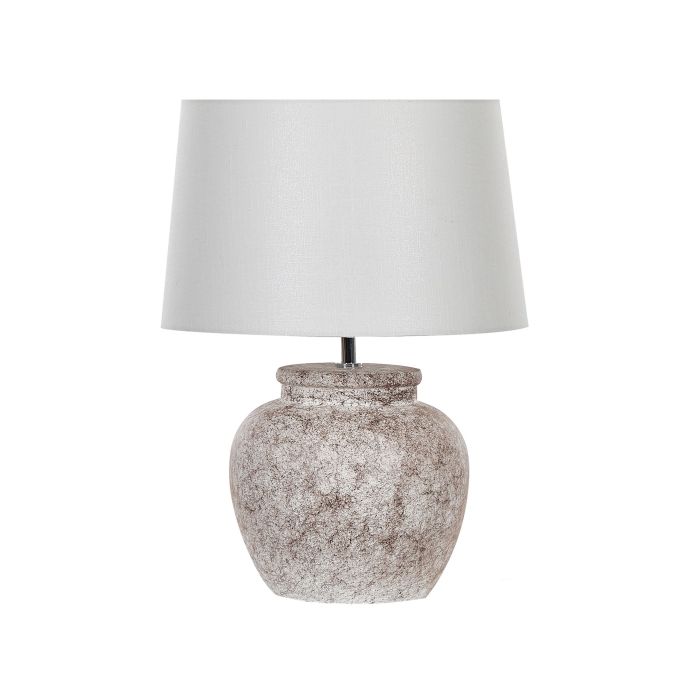 This accent table lamp will be a great fit for boho and Scandinavian living rooms and bedrooms. Its ceramic base has a neutral colour and finish resembling small cracks. Fitted with a white shade, it surrounds the interior with soft, diffused light, creating a moody atmosphere. Details: Color: Beige, White. Main material: Ceramic. Additional material: Cotton, Jute. Material Composition: 65% Jute, 35% Cotton Weight: 2 Assembly: Does Not Require Assembly