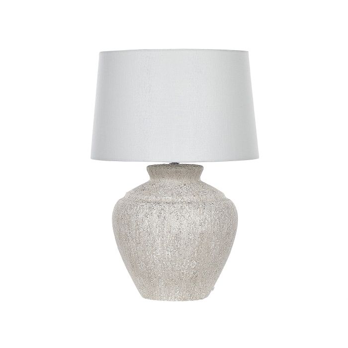 Light up your interior with this traditional lamp, made out of durable and easy-care ceramic. Its base, not only low maintenance, resembles a stone, which adds to the uniqueness of the piece and draws attention to it. The lamp also features a handmade fabric shade, in a matching, white colour. It will look best if paired with other elements in light shades, in a variety of interior decor styles. Details: Color: White. Main material: Ceramic. Additional material: Cotton, Jute. Material Composition: 65% Jute, 35% Cotton Weight: 3 Assembly: Partial Assembly Required