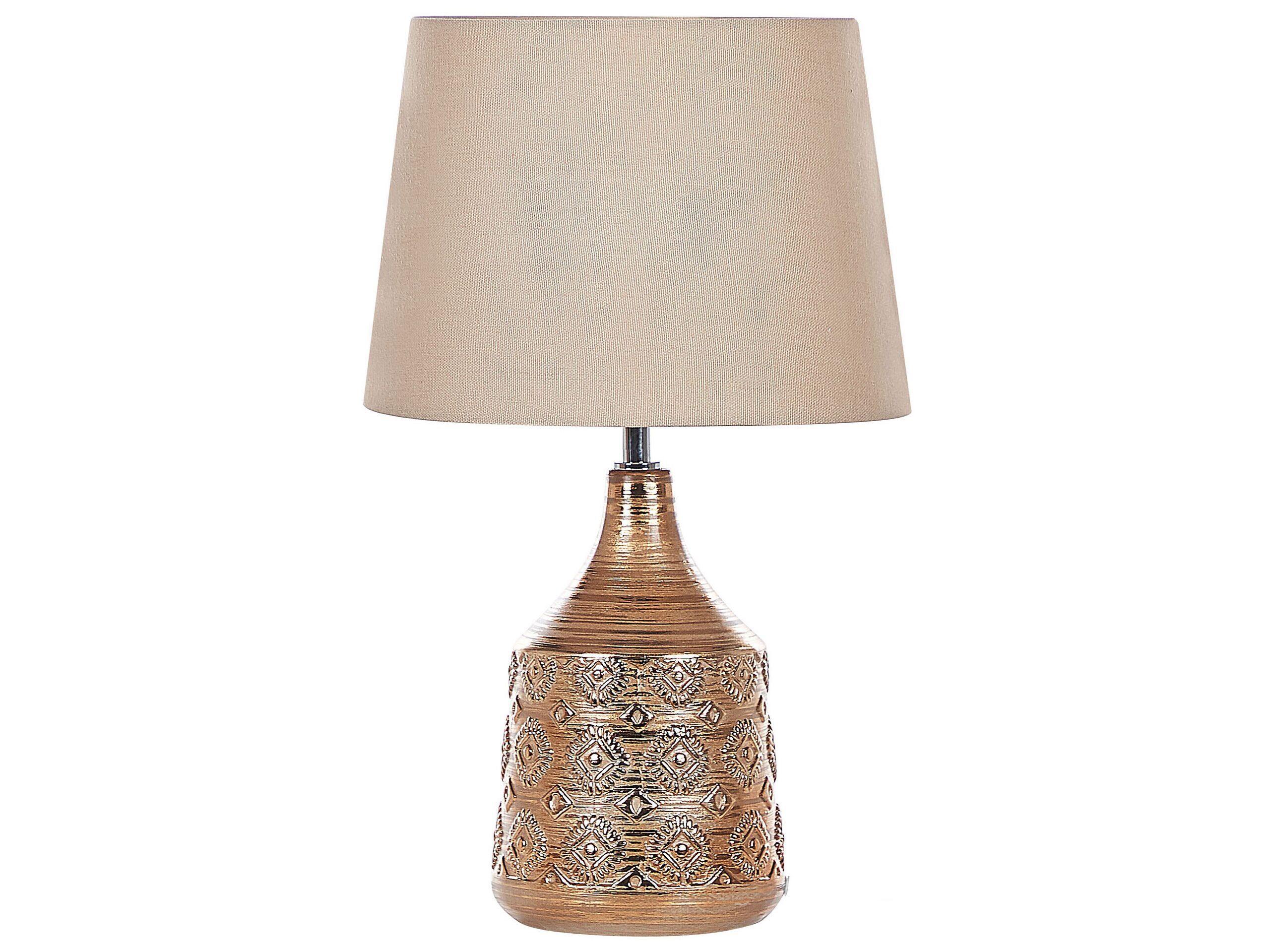 This stylish table lamp showcases a blend of retro charm and elegant design. Its base is decorated with unique ornaments and is crafted from high-quality ceramic. The lamp creates a relaxing atmosphere in your home thanks to the empire-shaped shade that gently diffuses the light. You can place it both on a bedside table or on a side table in your living room. Details: Color: Brown, Beige. Main material: Ceramic. Additional material: Cotton, Jute. Material Composition: 65% Jute, 35% Cotton Weight: 2 Assembly: Partial Assembly Required