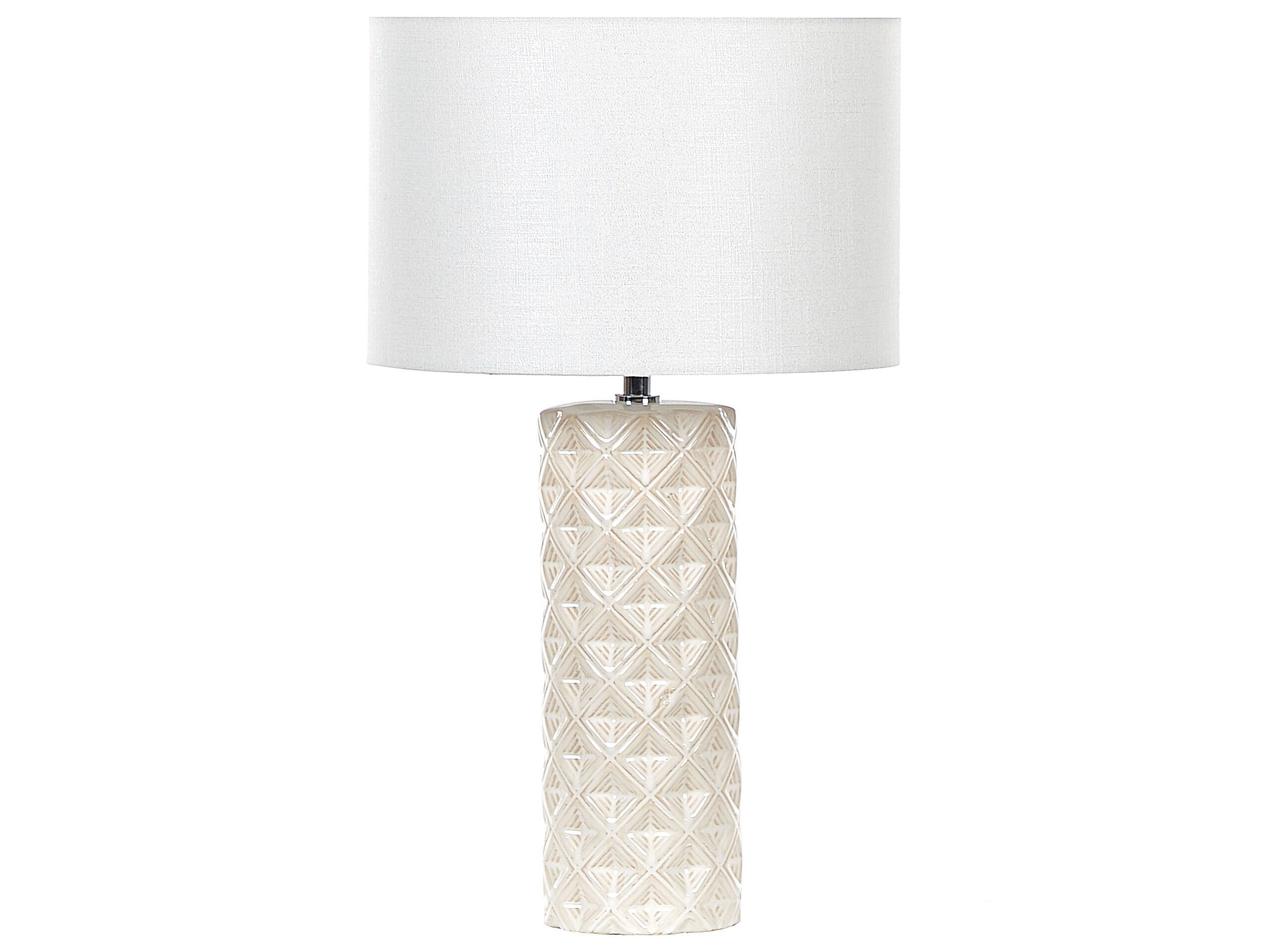 This elegant table lamp is a great way to introduce a stylish lighting to your interior. Featuring a sleek, ceramic base with a trendy, geometric pattern, it comes with a classic drum-shaped shade that helps to create a cosy atmosphere in your house. The lamp is an ideal addition to your bedroom, living from and home office. Details: Color: White, Beige. Main material: Ceramic. Additional material: Cotton, Jute. Material Composition: 65% Jute, 35% Cotton Weight: 2 Assembly: Partial Assembly Required