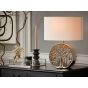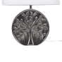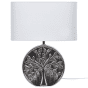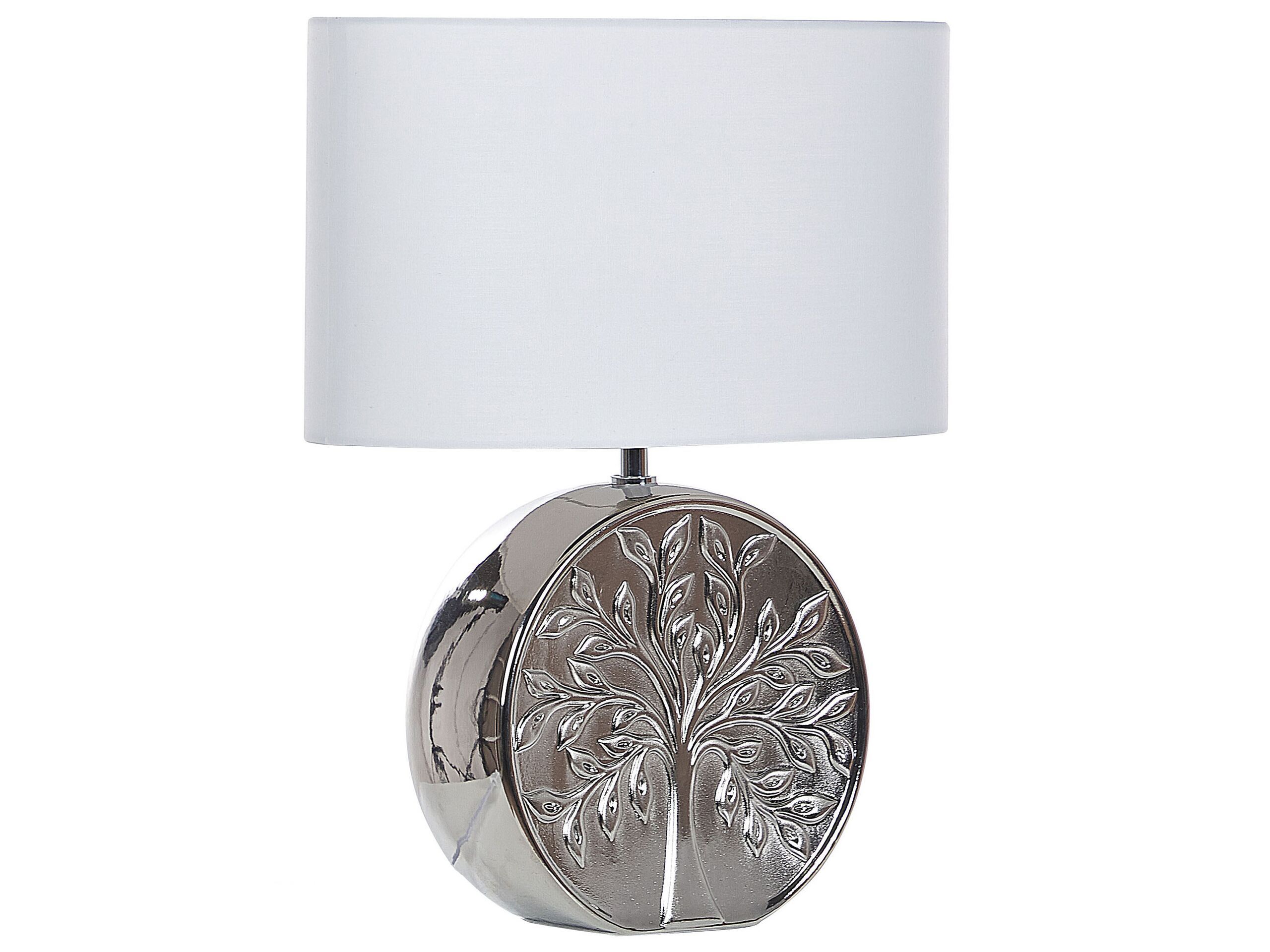 A practical table lamp that fits both bedrooms and living rooms, while boasting a bold stylistic. Its body is finished in a glossy colour, lending it an elegant glam flair. Thanks to a carved tree motif, the lamp is eclectic, making it unique. The piece is great to provide moody lighting next to the sofa or to serve as reading help at the bedside. Details: Color: Silver, White. Main material: Ceramic. Additional material: Polyester, Cotton. Material Composition: 40% Cotton, 60% Polyester Weight: 2 Assembly: Does Not Require Assembly