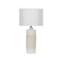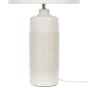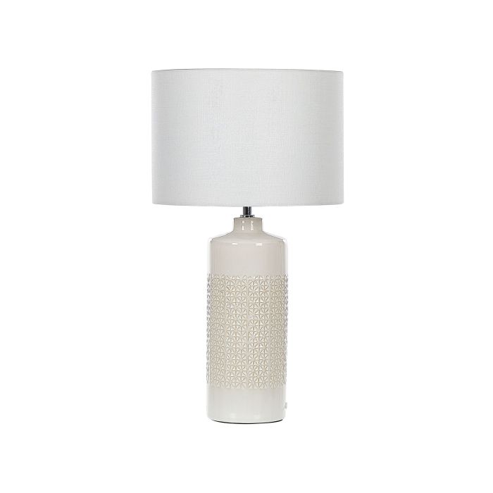 This Scandinavian accent table lamp is perfect for styling in living rooms or hallways. Its tall ceramic base is glossy and has an embossed pattern resembling tiny stars. Fitted with a shade, it gives a soft, diffused light, which creates a moody atmosphere. Use it as ambient lighting next to your sofa, or as a reading help at the bedside. Details: Color: White. Main material: Ceramic. Additional material: Cotton, Jute. Material Composition: 65% Jute, 35% Cotton Weight: 2 Assembly: Does Not Require Assembly