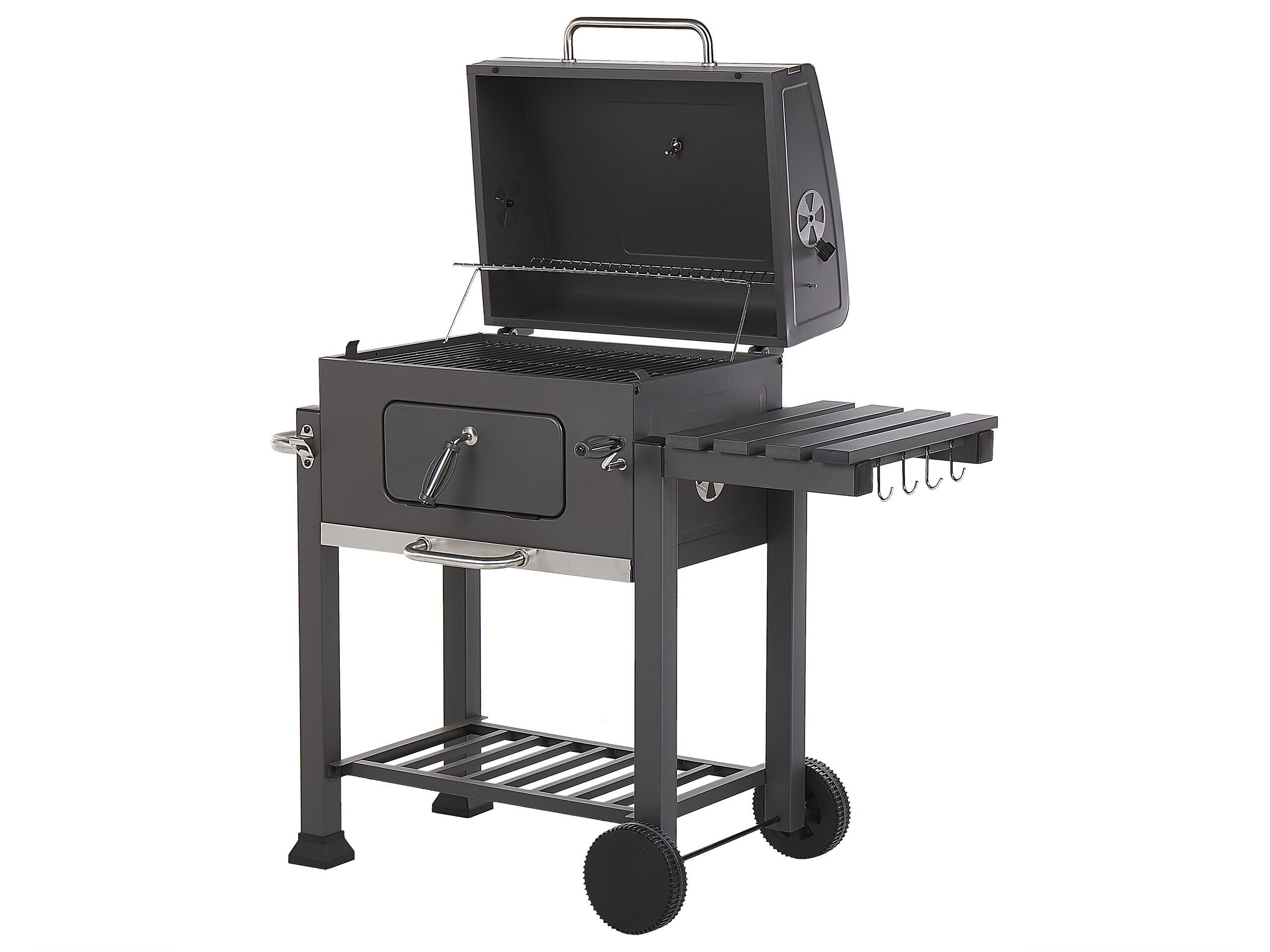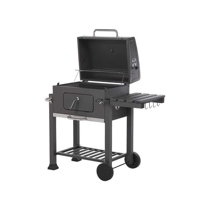 This charcoal grill brings functionality to every BBQ party. Made from steel body in powder coated finish is heavy, and provides stability. Thanks to the integrated wheels, you can easily move it from place to place. The grill features a covered cooking chamber with a wide grate area and a warming rack for slow cooking or keeping your food warm. The lid has a thermometer so that you can easily monitor the heat. The two shelves, one on the side and one on the bottom, provide extra space for all your tools, while the hooks are perfect to hang a towel. The grill comes with a removable ashtray and a convenient ash pan drawer. Details: Color: Grey. Main material: Steel. Additional material: Stainless Steel. Weight: 25 Assembly: Full Assembly Required