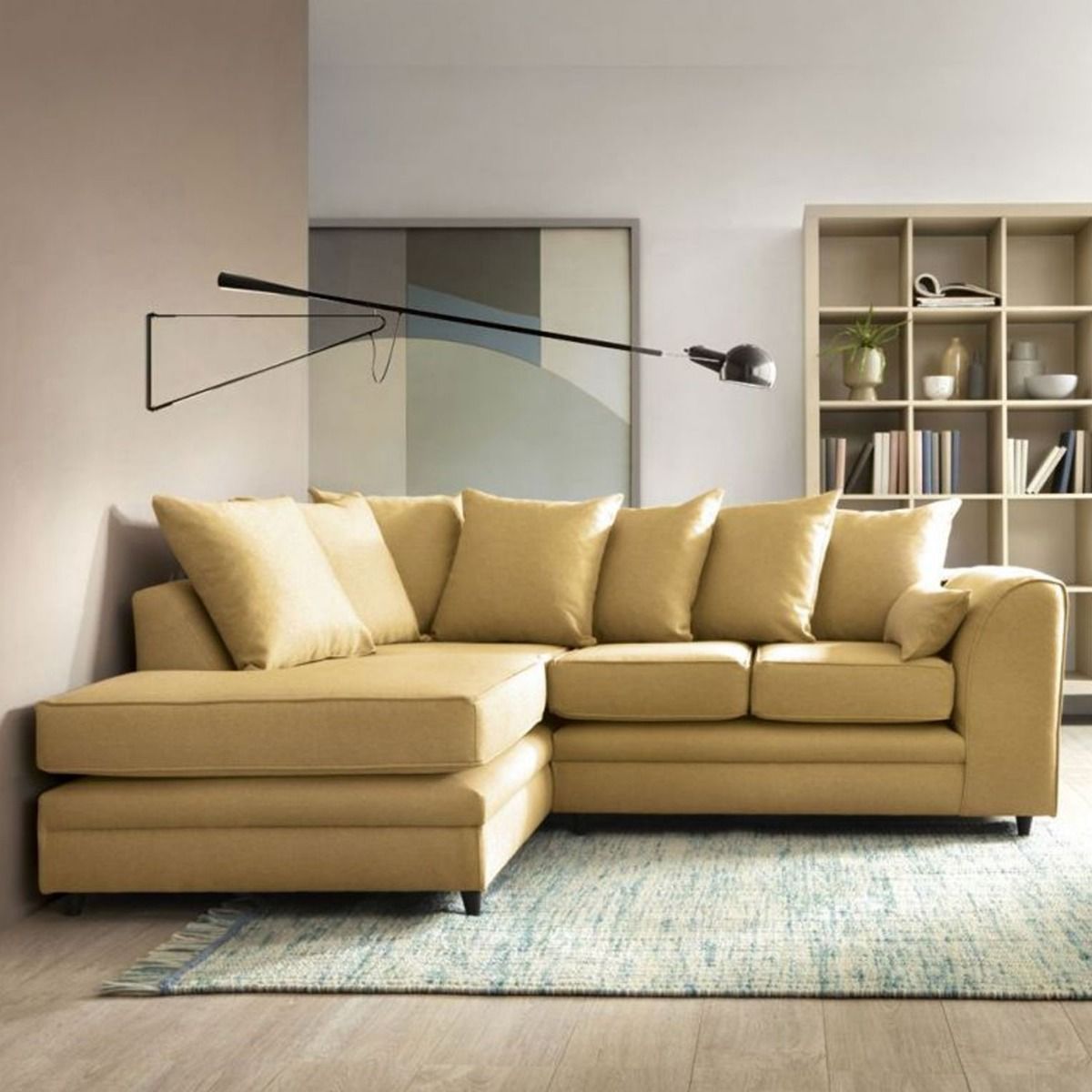 Charmaine! A beautiful corner sofa also available in dark grey, light grey, grey and a stunning mustard colour. Scatter cushions and extra wide angular arms give you all the cushioning your back and arms need, while the extra deep foam filled seats sit atop a plinth base with clean straight lines. Simplicity and a hint of flamboyance collide to give you a stunning sofa. Choice of upholstery is linen, guaranteed to keep you cool and snuggled.