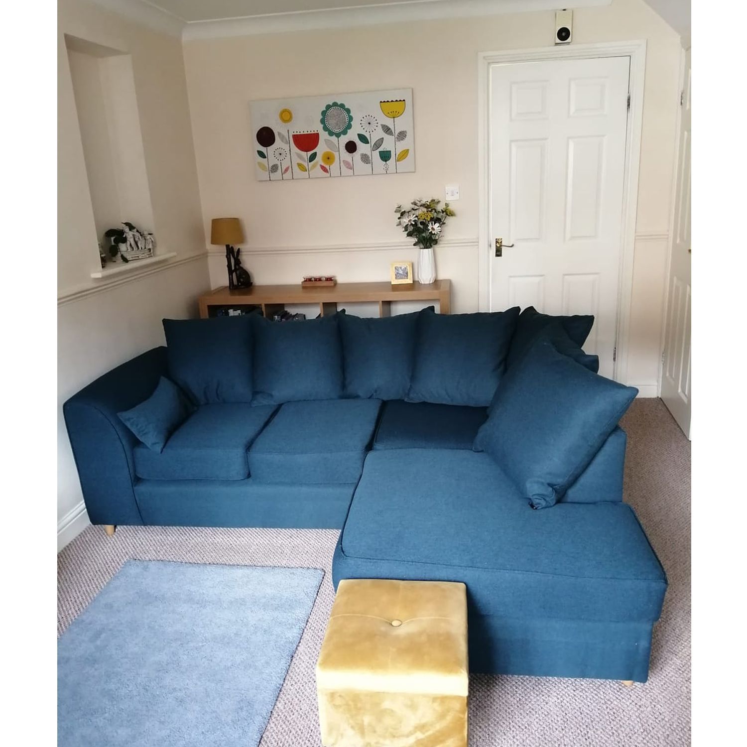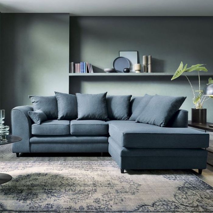 Charmaine! A beautiful corner sofa available in teal and light blue colour. Scatter cushions and extra wide angular arms give you all the cushioning your back and arms need, while the extra deep foam filled seats sit atop a plinth base with clean straight lines. Simplicity and a hint of flamboyance collide to give you a stunning sofa. Look out for the mix and match accent cushions option. Choice of upholstery is linen, guaranteed to keep you cool and snuggled.